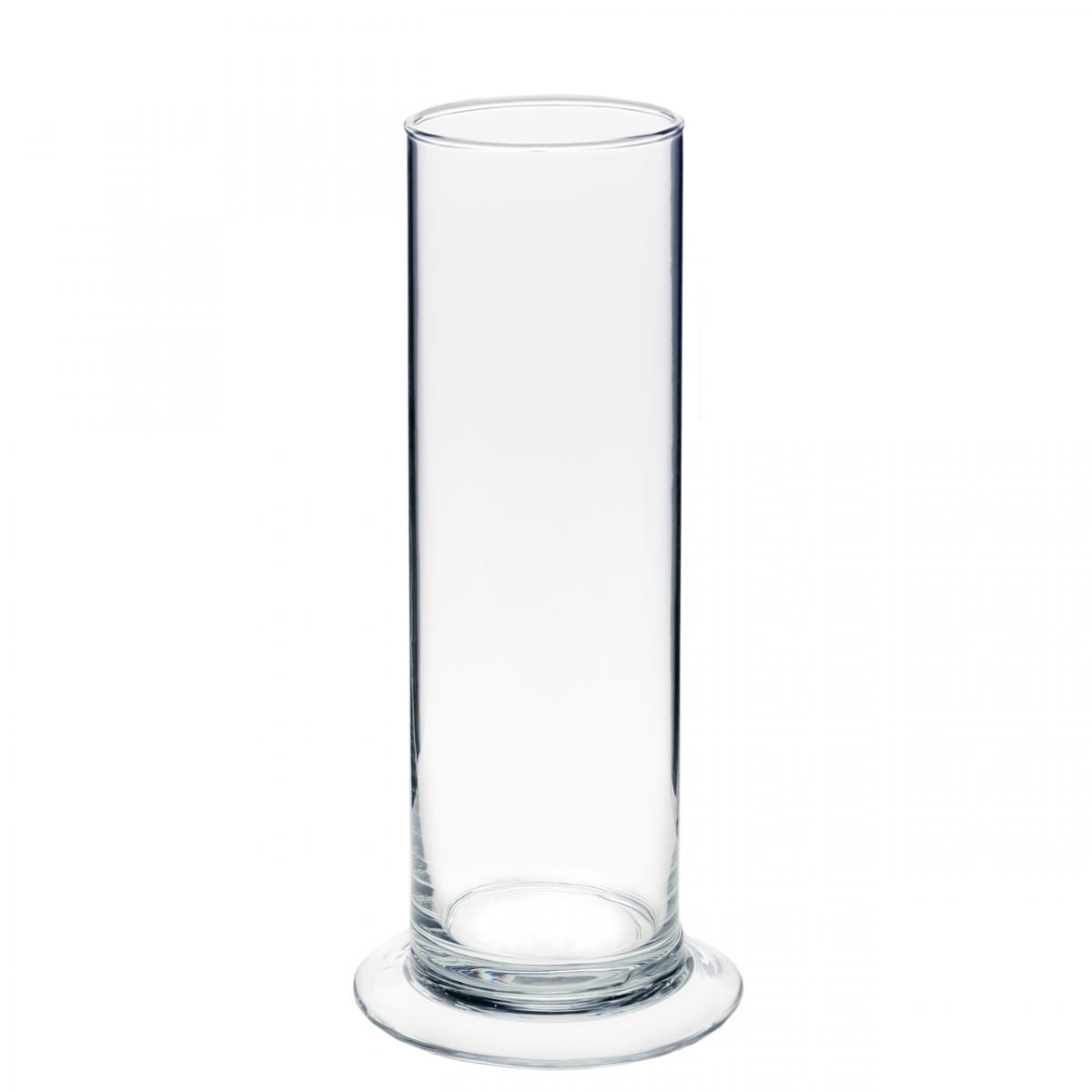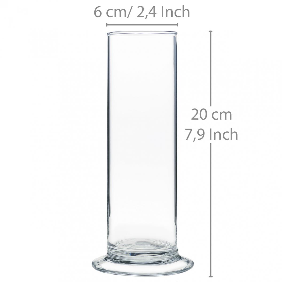 Der schlanke Glas-Zylinder mit Fuß ist insgesamt circa 20 Zentimeter hoch. Der Durchmesser der Vase selbst beträgt dabei ungefähr 6 Zentimeter.