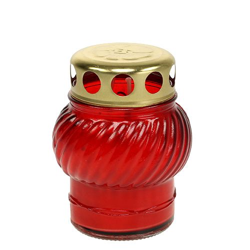 Mit diesem Grablicht, das in einer hübschen roten Glaskugel präsentiert wird, runden Sie eine Grabgestaltung geschmackvoll ab! Die weiße Stumpenkerze befindet sich in einem bauchigen Glas, das mit einem griffigen Rillenmuster versehen ist und mit einem goldenen Deckel aus Metall verschlossen ist. Der Metalldeckel schützt die Flamme dabei vor Wind und Regen, wobei er oben noch mit einem Blumenmuster verziert und an der Seite mit Löchern bestückt ist.