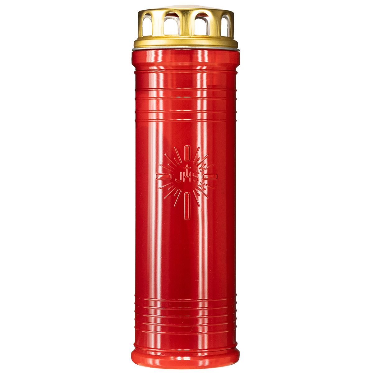 Die Grablichter in Rot haben eine Höhe von rund 24,5 Zentimetern und einen Durchmesser von circa 7,5 Zentimetern. Auf Vorder- und Rückseite der Kerzenhülle aus Kunststoff befindet sich ein Relief mit einem Kreuz im Strahlenkranz und dem Monogramm „JHS“ in der Mitte. Dieses Monogramm ist die Kurzform von Jesus und unterstreicht die Bedeutung des Glaubens, gerade in einer so schweren Zeit, wenn wir einen geliebten Menschen verloren haben.