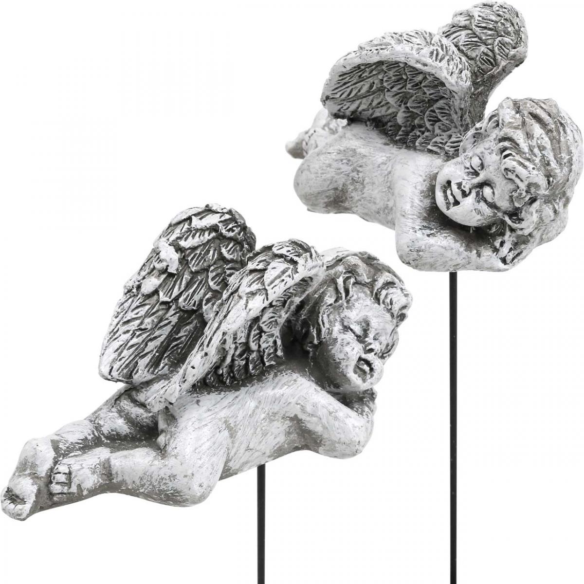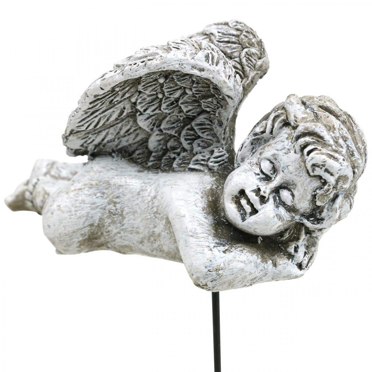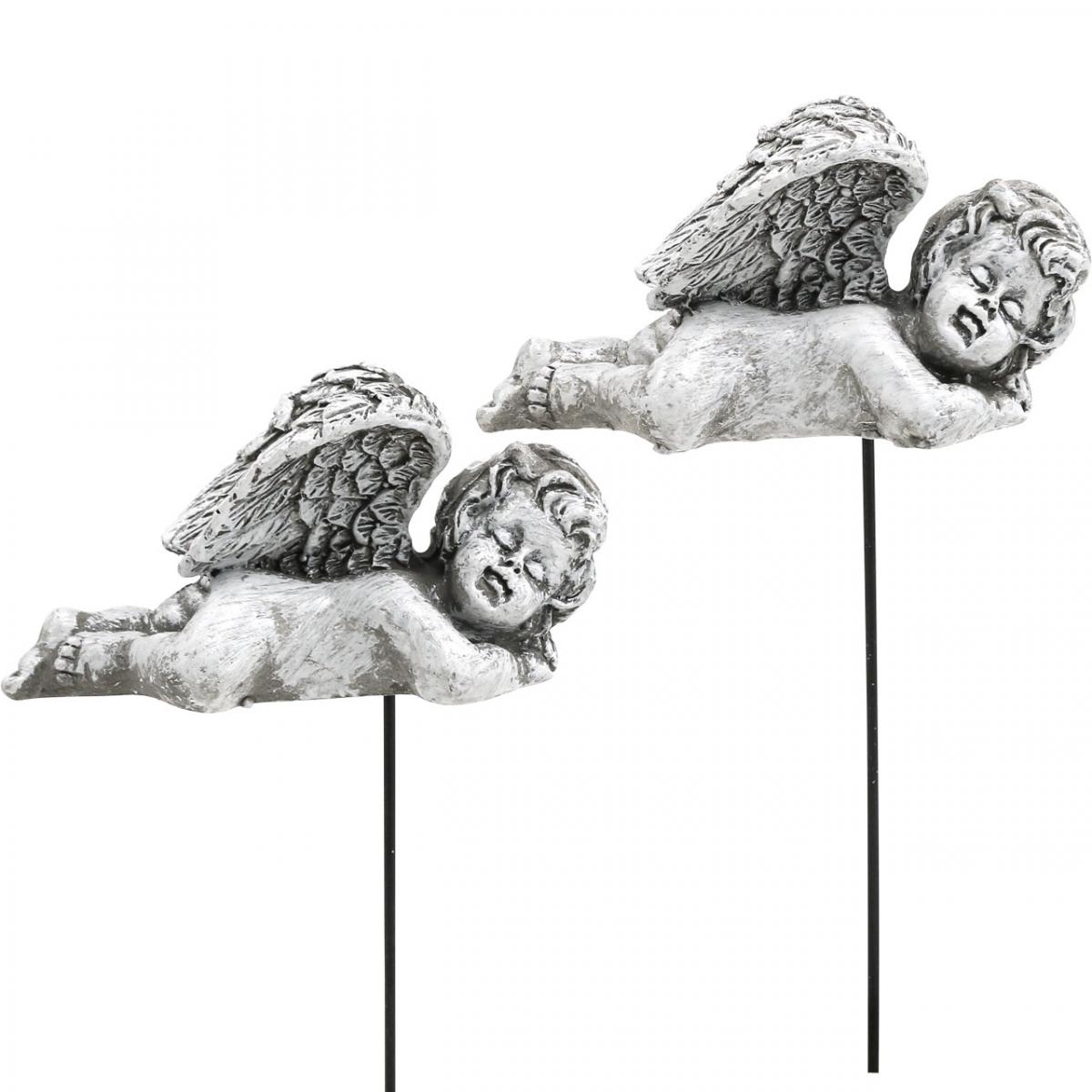 Die liegende niedliche Engelsfigur legt mit geschlossenen Augen ihren Kopf auf die Hände und wirkt dabei sehr friedlich. Die Figuren sind in Hellgrau mit dunkleren und helleren Akzenten gehalten. Am Metallstab lassen sich die stabilen Dekostecker bequem in Styropor oder Steckschaum stecken.