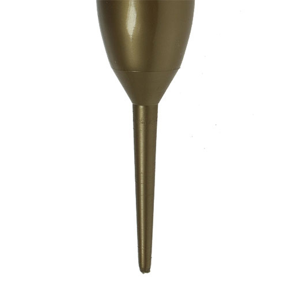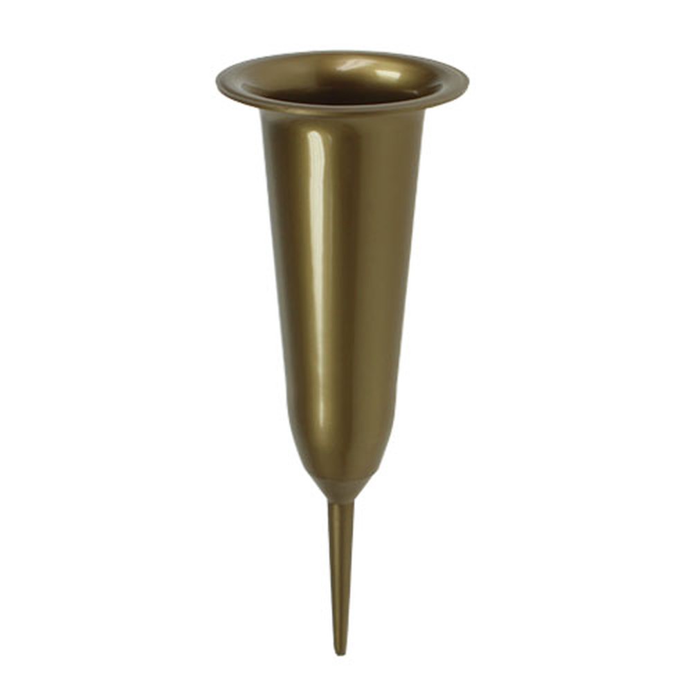 An der Oberseite befindet sich ein breiter Rand, welcher einen Trauerstrauß in Form hält und auch schweren Blütenköpfe abstützen kann. Dabei bietet die Vase für das Grab genügend Platz für das Wasserreservoir und dazugehörige Nährstoffe. Neben Frischblumen kann die Blumenvase auch gut mit Trockenpflanzen oder Seidenblumen für die Grabdekoration bestückt werden. Durch die goldene Farbe der Steckvase wird die Trauerfloristik edel hervorgehoben.