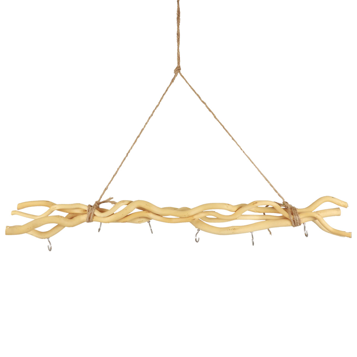 Das Bündel aus geschälten Ästen ist an der Unterseite mit insgesamt sechs eingeschraubten Haken versehen. Eine Kordel aus rustikalem Juteband hält die hellen Äste zusammen und bietet mit einer nach oben führenden Schlaufe zudem noch die Aufhängung für die Hakenleiste.