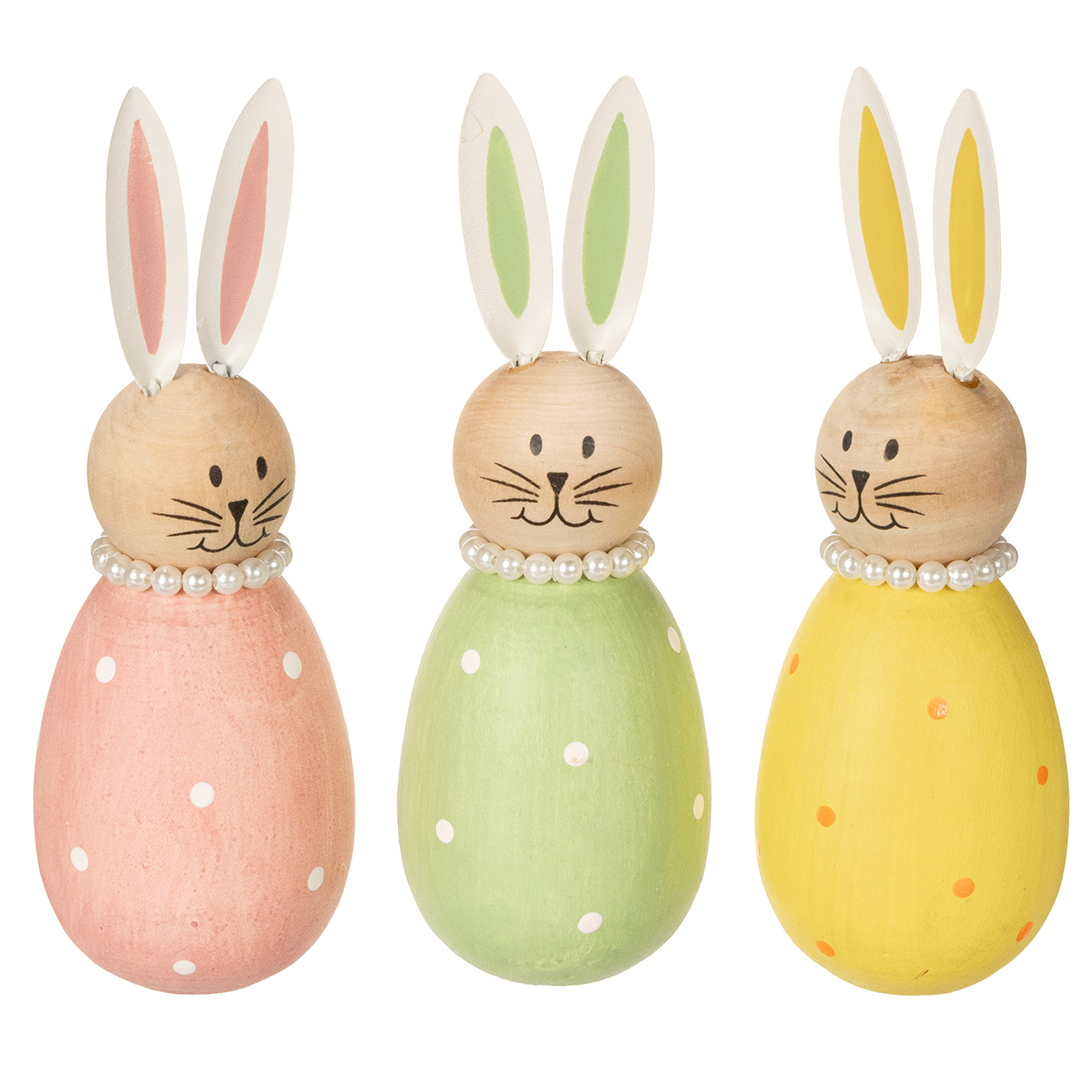 Produktname: Holz Osterhasen Dekofiguren Pastellfarben 3er Set 14,5 cm mit Perlendetails