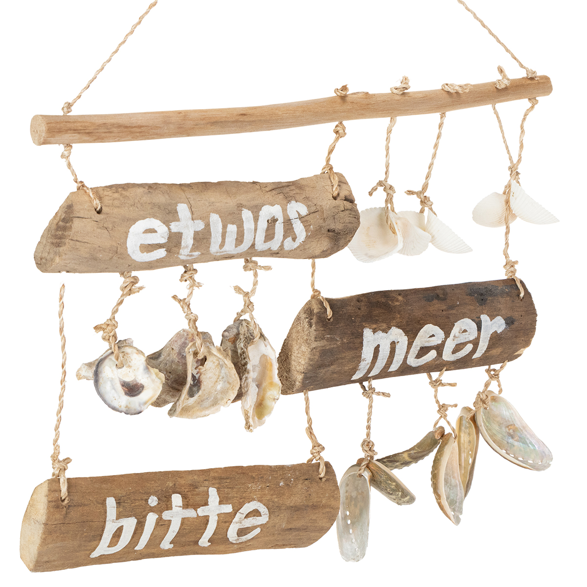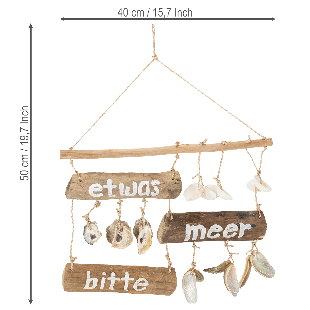 - Material: Naturbelassenes Treibholz und echte Muscheln