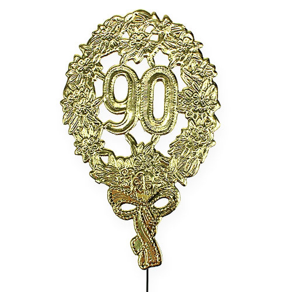Die Jubiläumszahl „90“ kann in floristische Dekorationen aller Art eingebunden werden und misst ungefähr 8 mal 12 Zentimeter. Die Ziffer an sich hat ungefähr die Maße 3,3 mal 3,5 Zentimeter. Der ganze Deko-Stecker zum Jubiläum hat inklusive Steckdraht eine Gesamtlänge von circa 28 Zentimetern. Geliefert wird die Dekozahl in Gold in einer Packung mit 10 Stück.