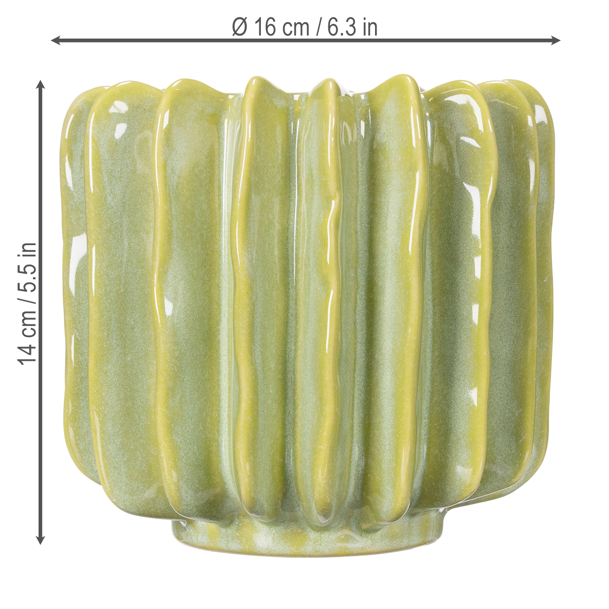 Gestalten Sie mit diesem einzigartigen Keramik Blumentopf in Kaktusoptik eine moderne und einladende Dekorlandschaft. Die harmonische grüne Oberfläche, kombiniert mit dem gerillten Design, bringt Ruhe und Eleganz in jede Umgebung. Mit seiner Größe von 16 cm im Durchmesser und einer Höhe von 14 cm eignet sich dieser Topf perfekt für kunstvolle Arrangements mit Sukkulenten, Kakteen oder kleinen künstlichen Grünpflanzen. Er ist langlebig, pflegeleicht und speziell für anspruchsvolle Kunden in der Floristik und Innendekoration konzipiert.