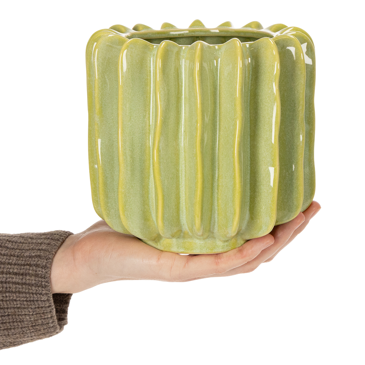 Beeindrucken Sie Ihre Kunden mit diesem einzigartigen Design-Highlight: Ein Blumentopf aus hochwertiger grüner Keramik, inspiriert von der natürlichen Schönheit von Kakteen. Schaffen Sie eine wohltuende Atmosphäre und verleihen Sie Ihren Räumen einen Hauch von Urban Jungle.