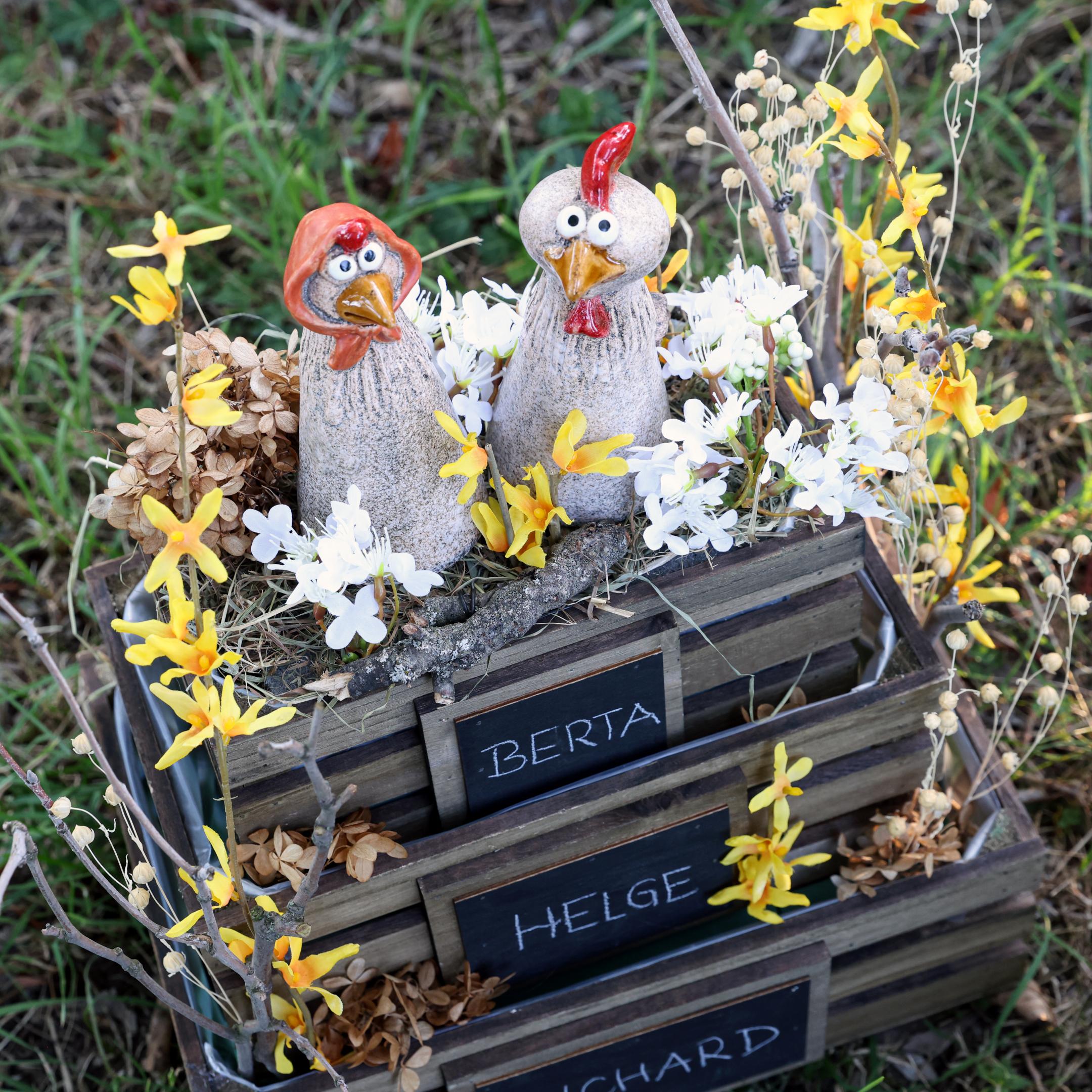 Mit witzigen Details und handbemaltem Charme sind diese Keramik-Hühner ideal für Osterarrangements. Ihre erdigen Töne passen perfekt zu rustikalen Vasen und künstlichen Blumen. Die Kombination mit bunten Eiern oder weiteren Keramikfiguren aus unserem Sortiment schafft ein stimmiges Ensemble.