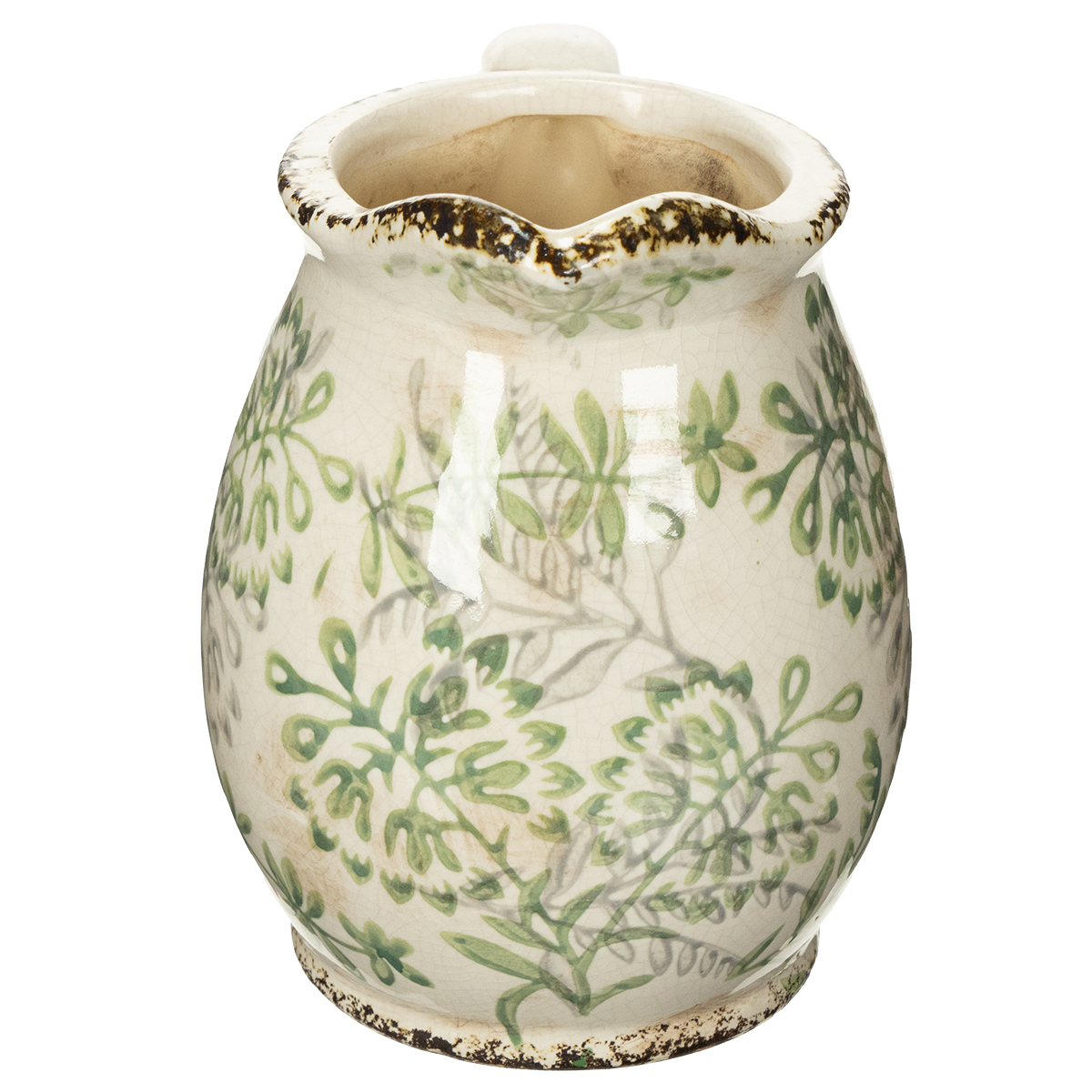 Dieser dekorative Krug ist nicht nur ein Gefäß, sondern ein echtes Statement-Piece in Ihrem Sortiment. Die robuste, langlebige Keramik und das verspielte Pflanzenmotiv in Weiß und Grün ziehen bewundernde Blicke auf sich. Die gewollt abgesplitterten Details am Rand verleihen dem Krug seinen charakteristischen Vintage-Charme, ideal für eine rustikale Atmosphäre.