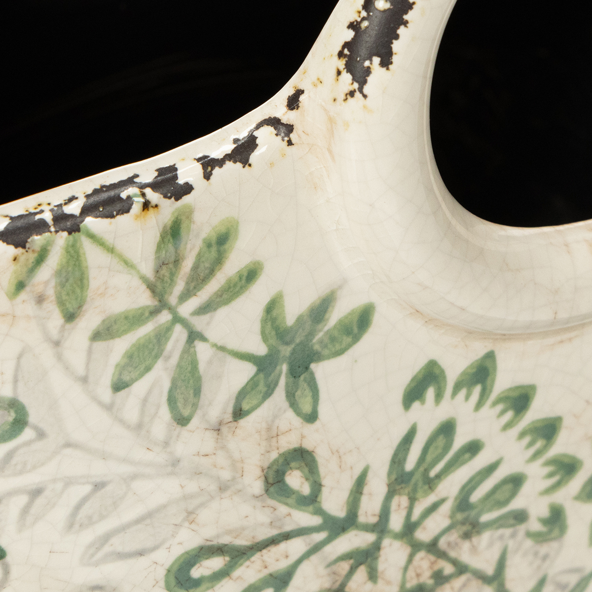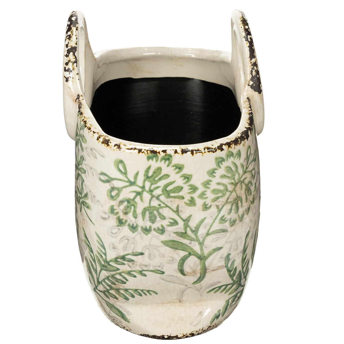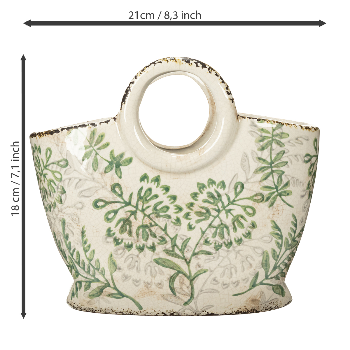 Diese handbemalte Keramiktasche begeistert mit ihrem nostalgischen Charme. Die weiße Oberfläche mit dezent grünen Blattverzierungen passt hervorragend zu Dekoartikeln im Landhausstil oder Boho-Design. Gleichzeitig überzeugt die Tasche durch Robustheit und Funktionalität. Ob auf einer Küchenanrichte, im Restaurantbereich oder in Ihrem Floristikgeschäft – dieser vielseitige Dekoartikel findet überall seinen Platz.