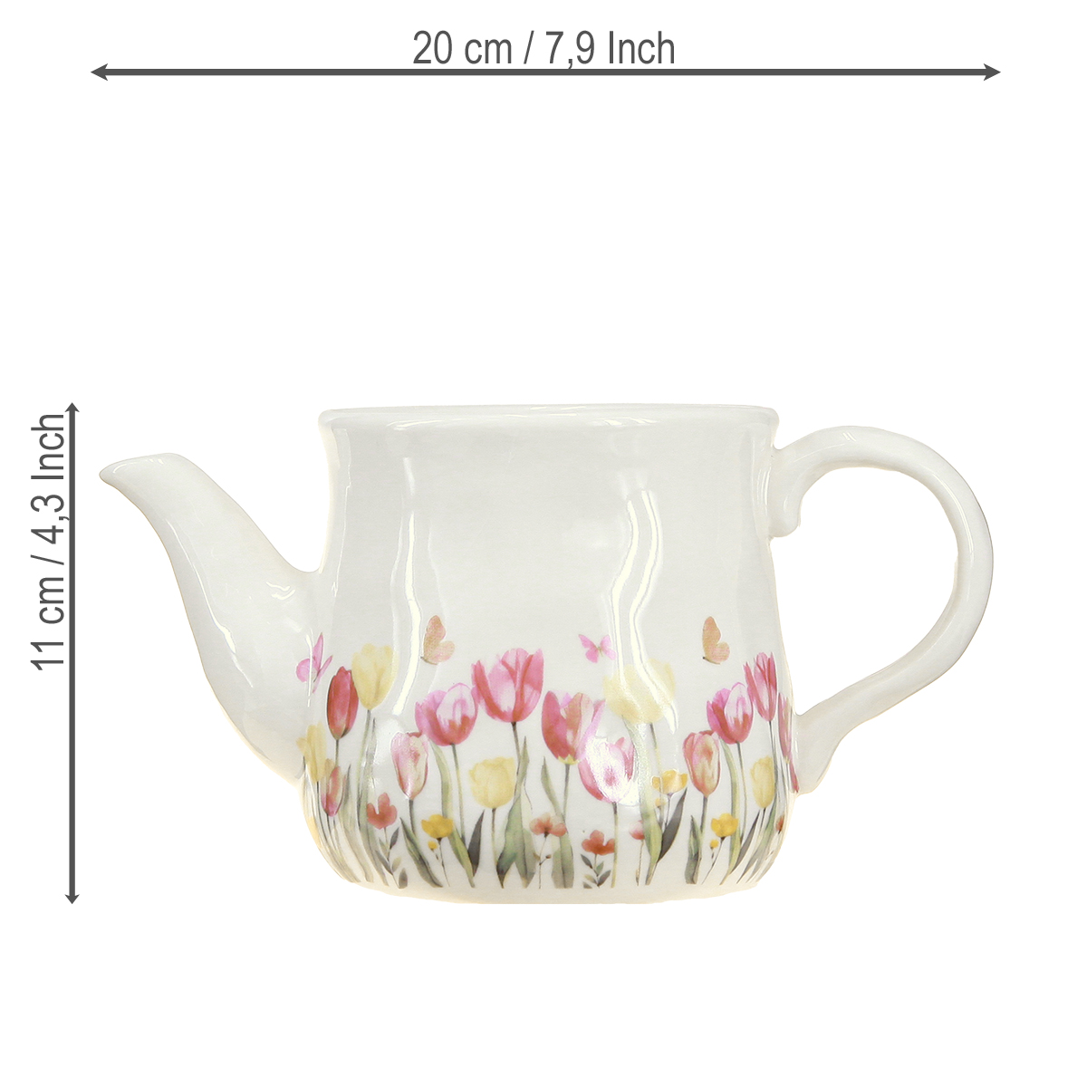 Die Kanne überzeugt durch ihre Maße von 20 cm Länge und einer Höhe von 11 cm – ideal für individuelle Dekorationsideen. Das zarte Blumenmotiv in sanften Bunttönen auf weißem Keramikgrund strahlt Leichtigkeit aus und passt perfekt zu Dekorationen im Landhausstil. Die robuste und langlebige Verarbeitung sorgt zudem für hohe Qualität und eine angenehme Haptik.