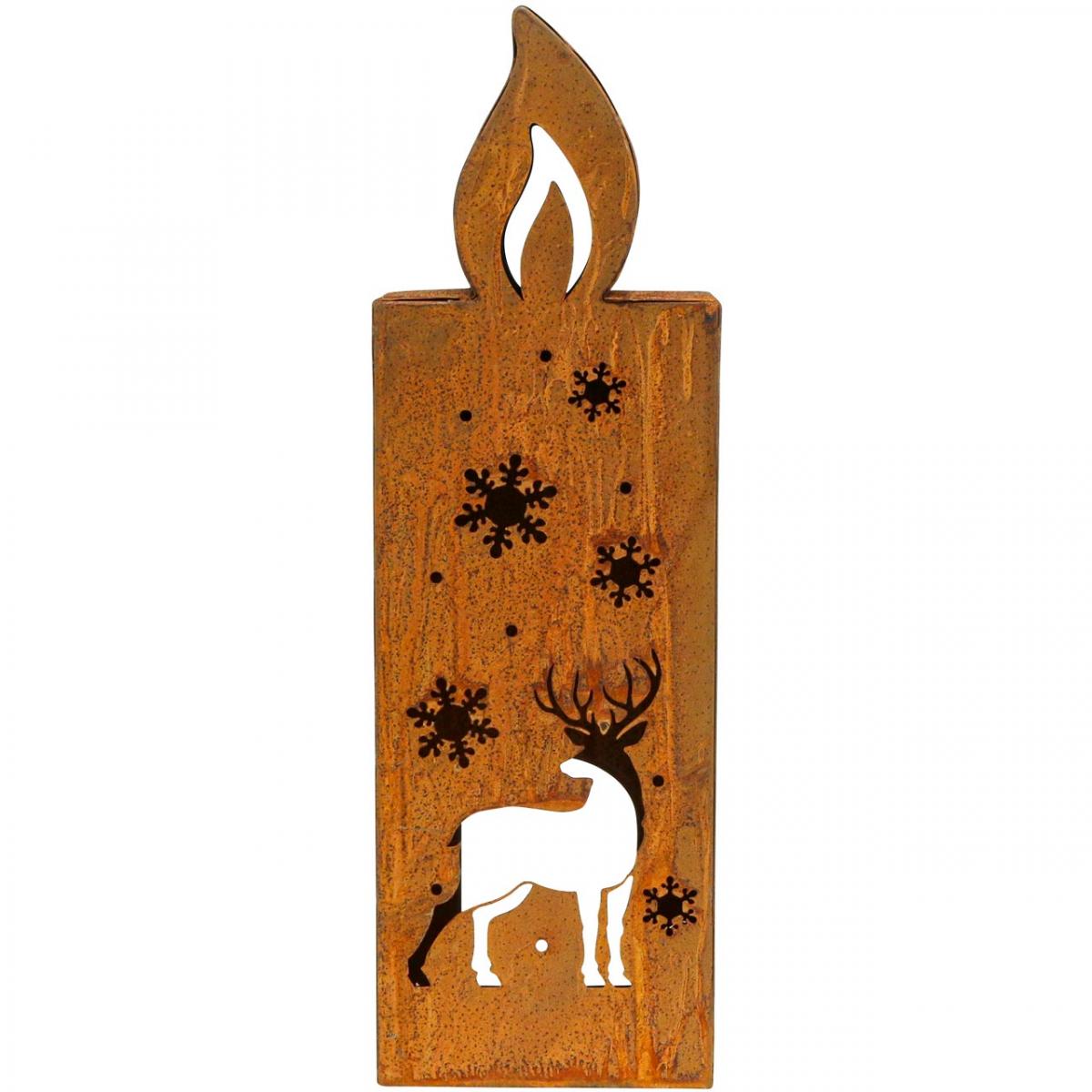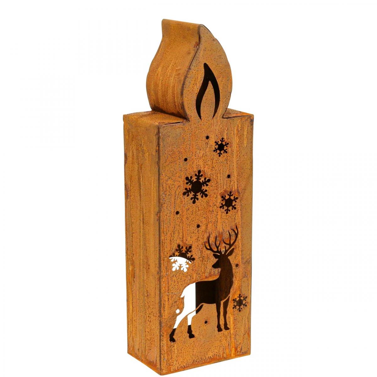 Geformt wie eine Kerze ist dieser Teelichthalter für Weihnachten eine ganz besonders originelle Idee. Der Kerzenhalter mit Edelrost besteht aus einem rechteckigen Gehäuse aus Metall, auf dessen Dach eine Flamme dargestellt ist.Die Rostdeko hat vorne Aussparungen, die die Umrisse eines Hirsches und fünf Schneeflocken zeigen. Auf der Rückseite befindet sich eine Öffnung, durch die Kerzen und Teelichter in die dafür gedachte Halterung gesetzt werden können.