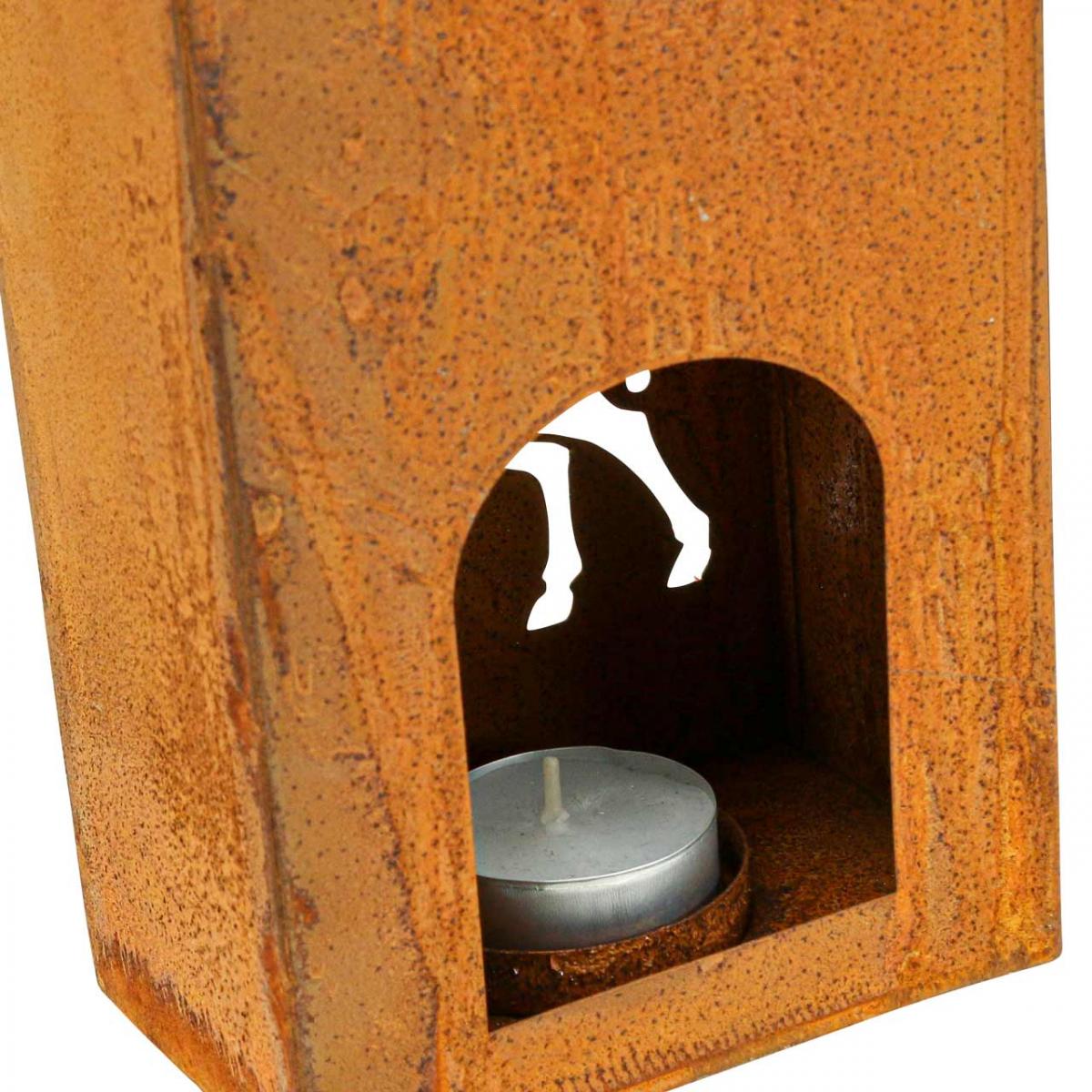 Die Rostdeko hat vorne Aussparungen, die die Umrisse eines Hirsches und fünf Schneeflocken zeigen. Auf der Rückseite befindet sich eine Öffnung, durch die Kerzen und Teelichter in die dafür gedachte Halterung gesetzt werden können.