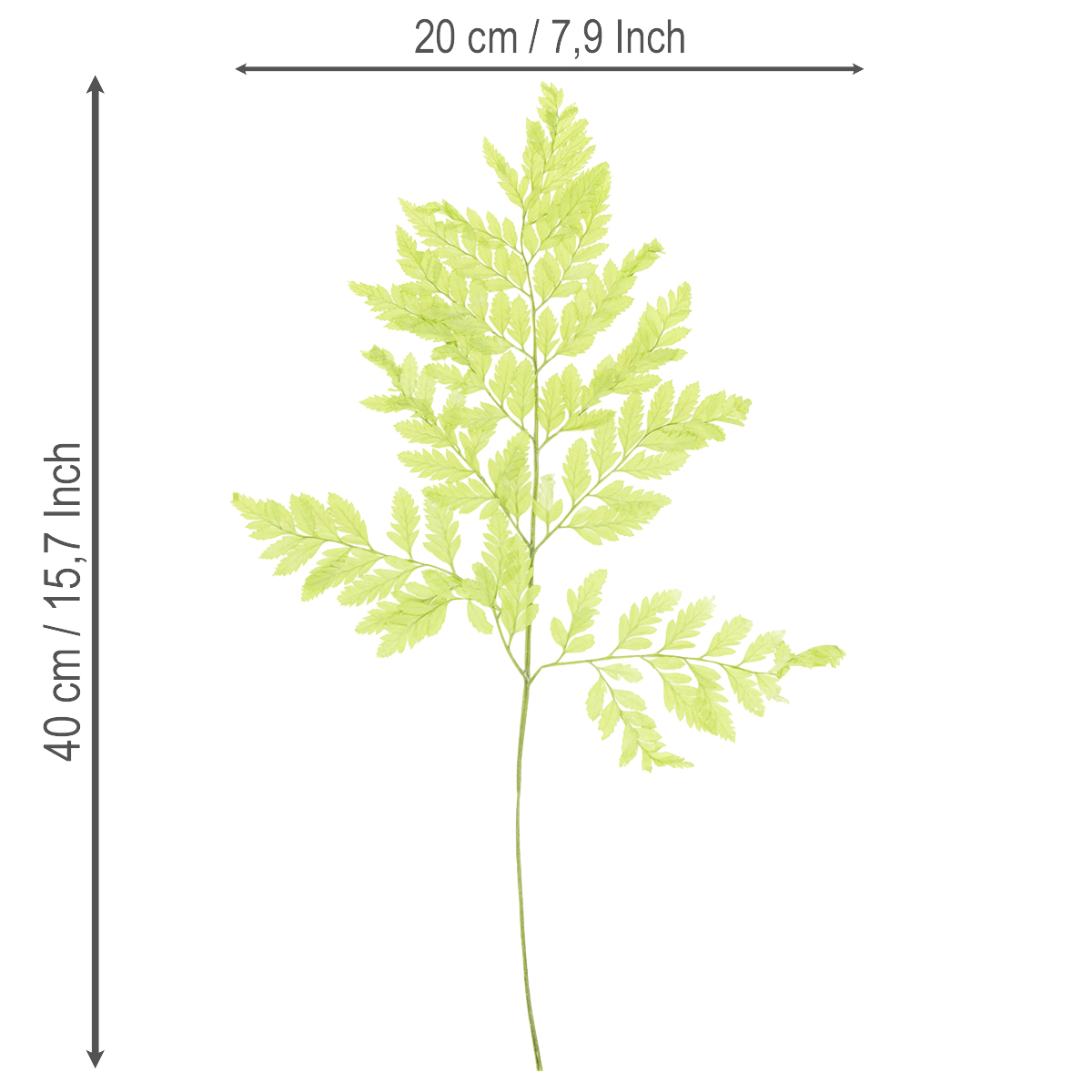 Diese konservierte Trockenpflanze ist ein natürliches Produkt, das durch schonendes Konservierungsverfahren haltbar gemacht wurde. Mit einer Höhe von etwa 40 Zentimetern und intensiver grüner Farberhaltung bietet der Farn eine vielseitige Möglichkeit zur Gestaltung von Innenräumen. Das Produkt wird im Set mit zehn Stielen geliefert.