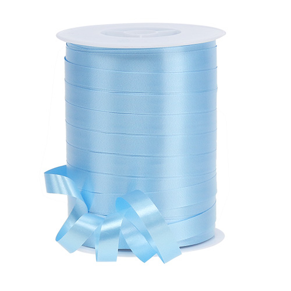 Auf einer weißen Kunststoffspule aufgewickelt, besitzt das glänzende Kräuselband in Hellblau eine Länge von circa 250 Meter und eine Breite von etwa 10 Millimeter.