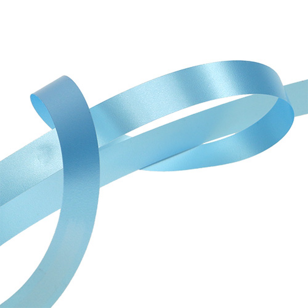 Das hübsche Kräuselband in Hellblau, das zu 100% aus Polypropylen besteht, misst in der Breite etwa 19 Millimeter und in der Länge ungefähr 100 Meter.