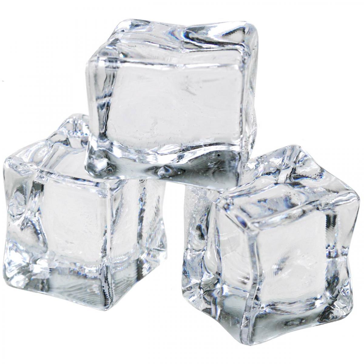 Diese künstlichen Eiswürfel sind aus Kunststoff und in Form und Beschaffenheit von echten nicht zu unterscheiden. Wie bei Eiswürfeln, die bereits etwas geschmolzen sind, haben diese auch abgerundete Ecken und Kanten.