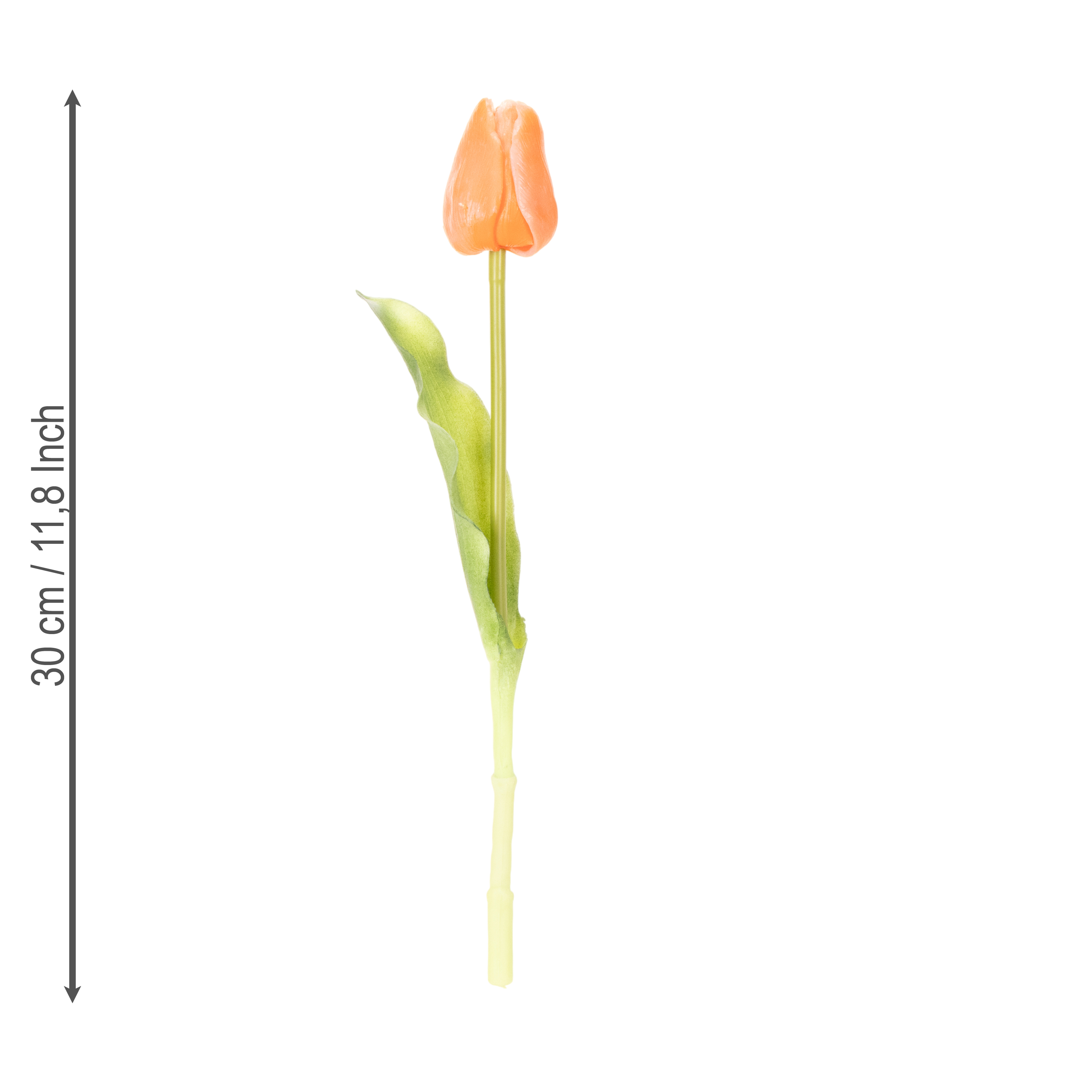 Unsere künstlichen Tulpen strahlen in einem harmonischen Orange und setzen elegante Akzente in jedem Raum. Ob als Blickfang im Schaufenster, auf festlichen Tafeln oder stilvollen Theken – die lebensechten Blumen sind eine perfekte Wahl für eine charmante Dekoration. Mit einer Höhe von 30 cm sind sie kompakt, aber dennoch auffallend und eignen sich hervorragend für eine Vielzahl an kreativen Einsatzmöglichkeiten.