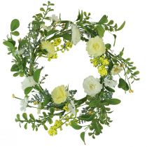 Blätter, Blüten und Knospen in Grün und Weiß formen einen natürlichen vielfältigen Kranz: Ton-in-Ton mit liebevollen Details und abgestimmten Farbnuancen, was die Bestandteile des Kranzes kaum von ihren echten Vorbildern unterscheiden lässt.