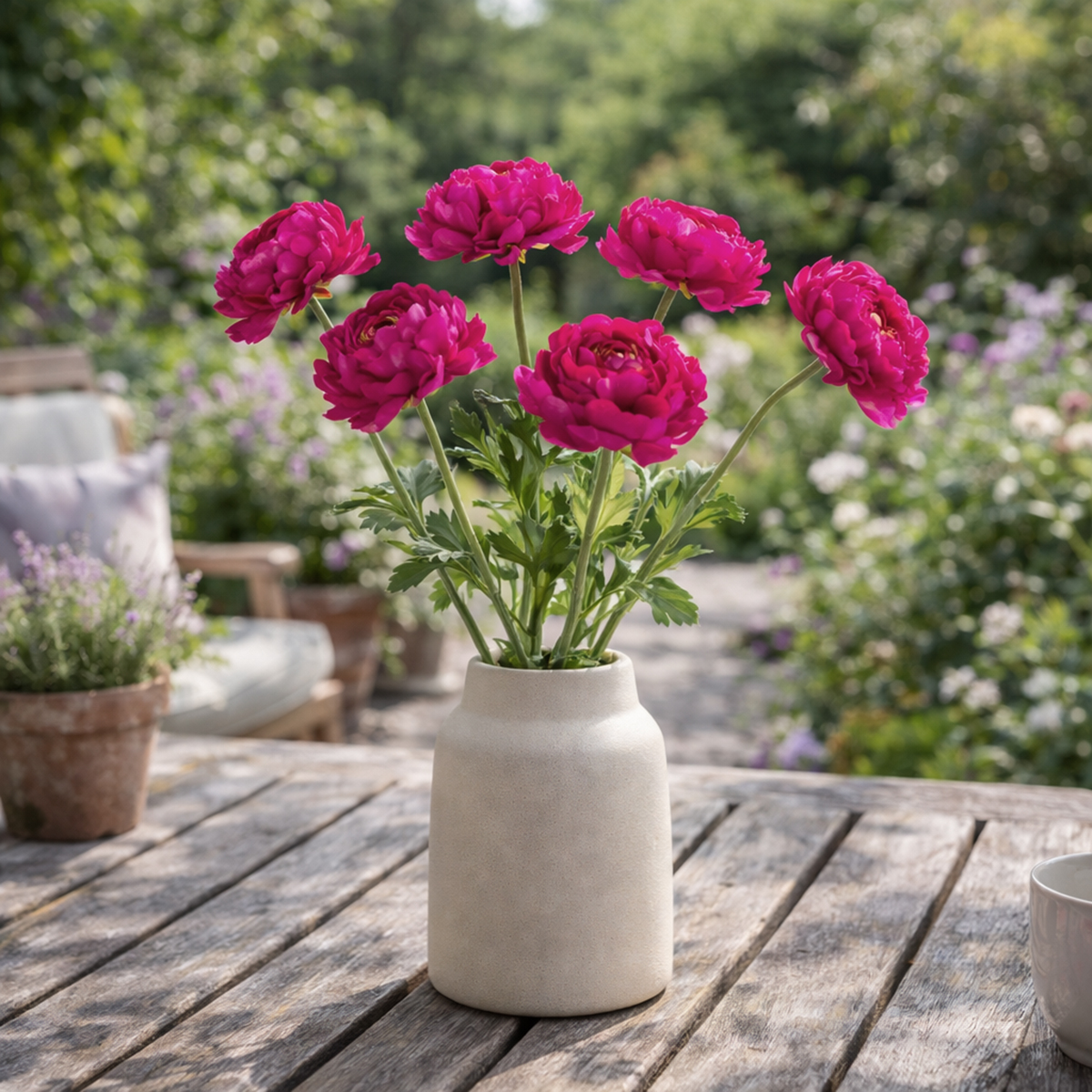 Die Ranunkel eignet sich hervorragend für stilvolle Deko-Anlässe, bei denen lebendige Blumen nicht infrage kommen. Ihre Symbolik von Anmut und Freude macht sie außerdem zu einem emotionalen Highlight in jedem Raum.