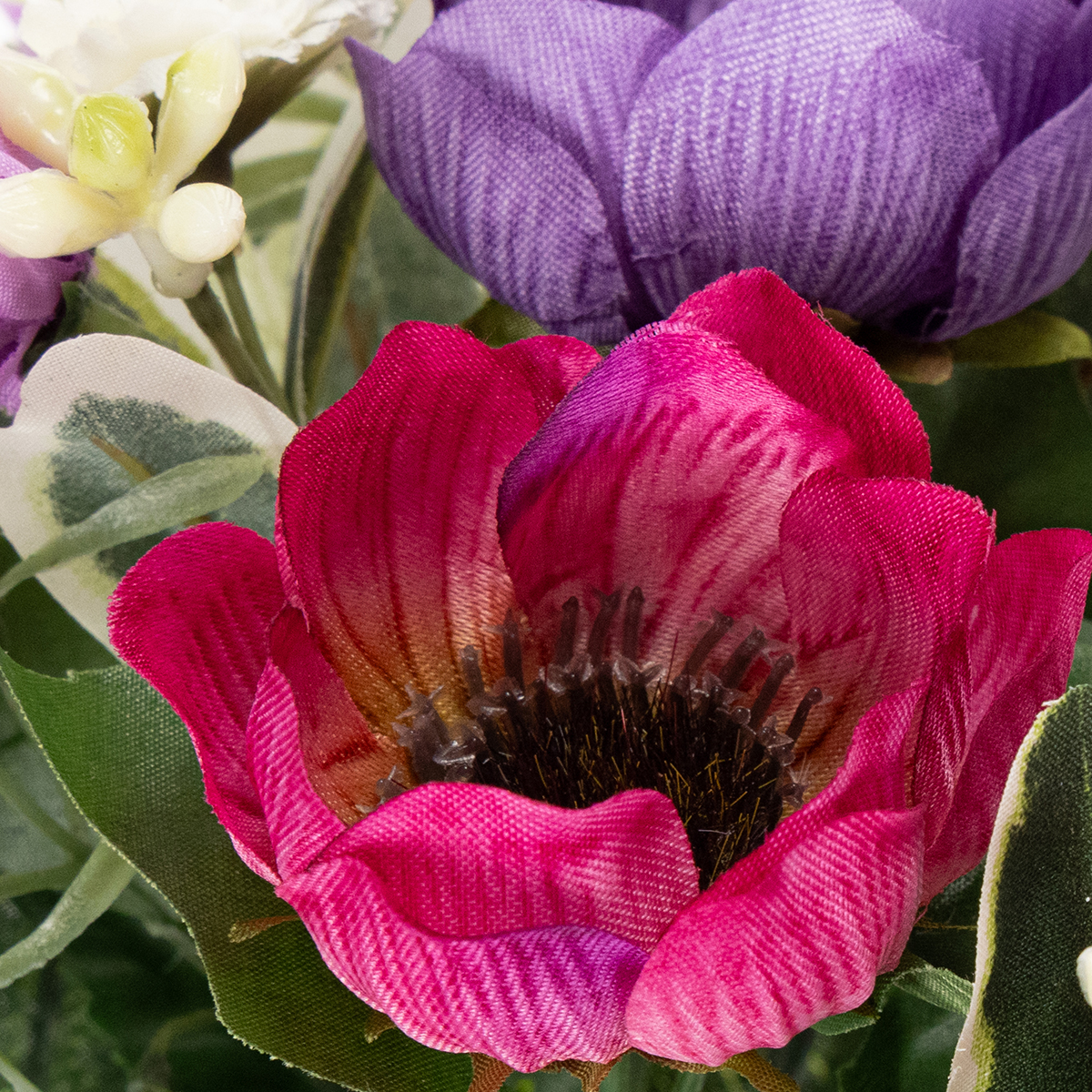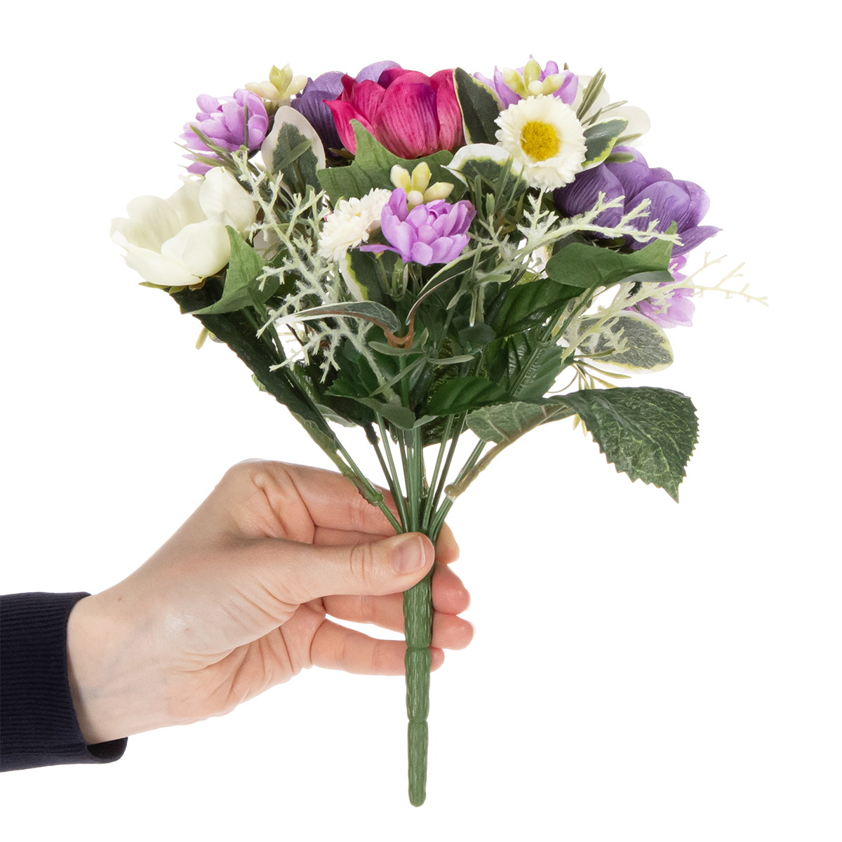Dieser detailreiche Kunstblumenstrauß vereint zarte Anemonen, verspielte Gänseblümchen und lebendige lila Farbakzente in einem harmonischen Arrangement. Mit seinem modernen Design, das Farben wie Weiß, Violett und Pink aufgreift, integriert er sich nahtlos in zeitgemäße Einrichtungsstile.