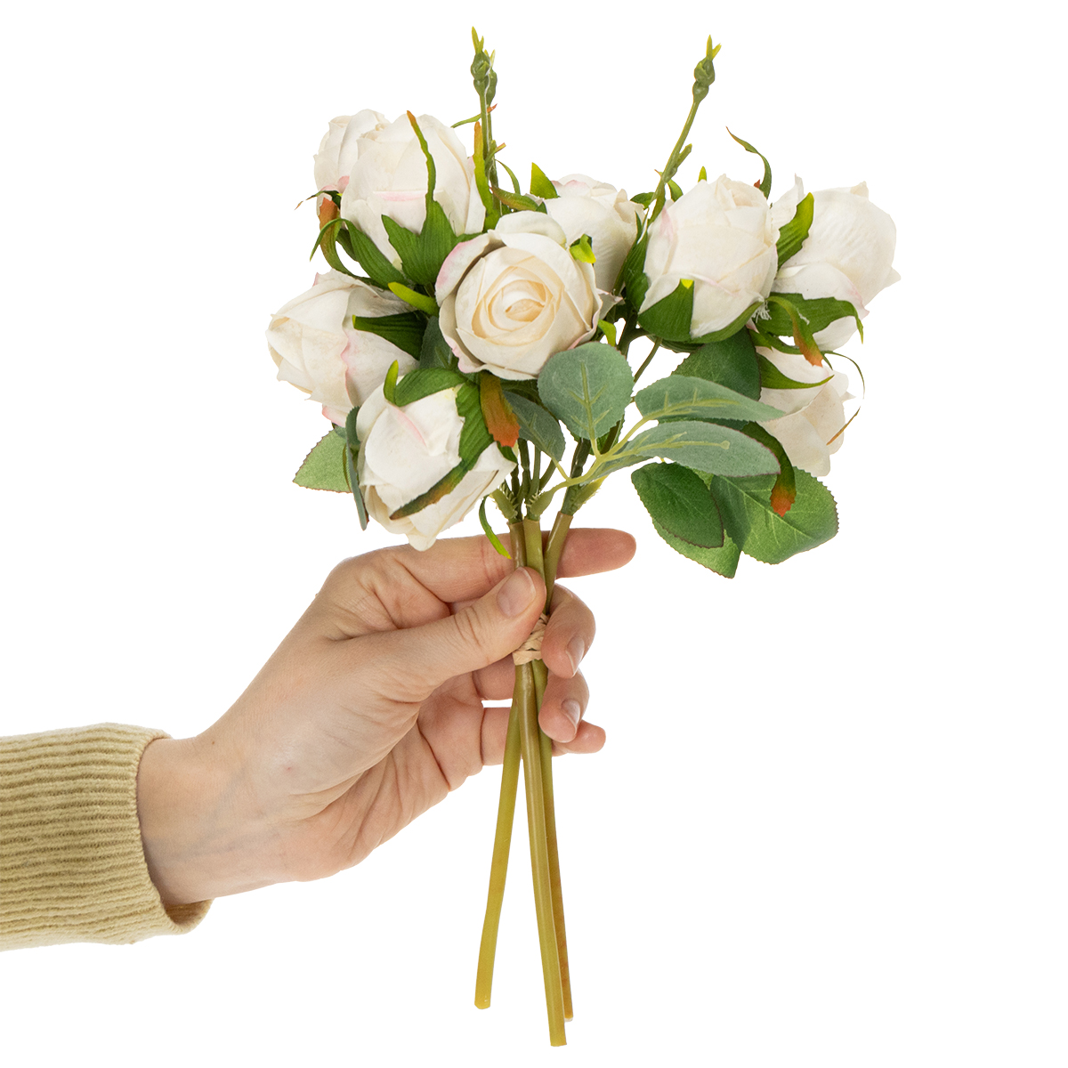 Verleihen Sie Ihren Räumlichkeiten eine stilvolle Eleganz mit diesem Kunstblumenstrauß aus weißen Rosen. Die hochwertige Verarbeitung und die natürlichen rosa Akzente machen dieses Arrangement zu einem echten Blickfang – ideal für eine anspruchsvolle Dekoration, die keine Pflege erfordert.