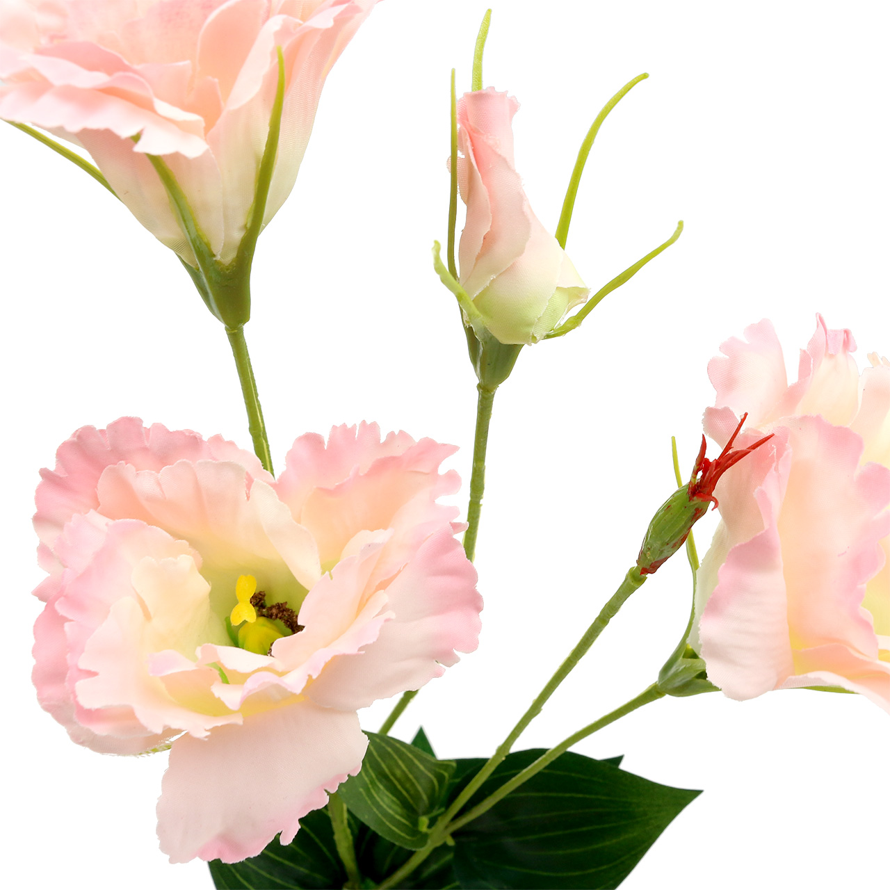 Der künstliche, rosafarbene Lysianthus-Zweig misst in der Länge circa 87,5 Zentimeter, während die einzelnen Blüten – die Knospe ausgenommen – etwa zwischen 7,5 und 9 Zentimeter groß sind.