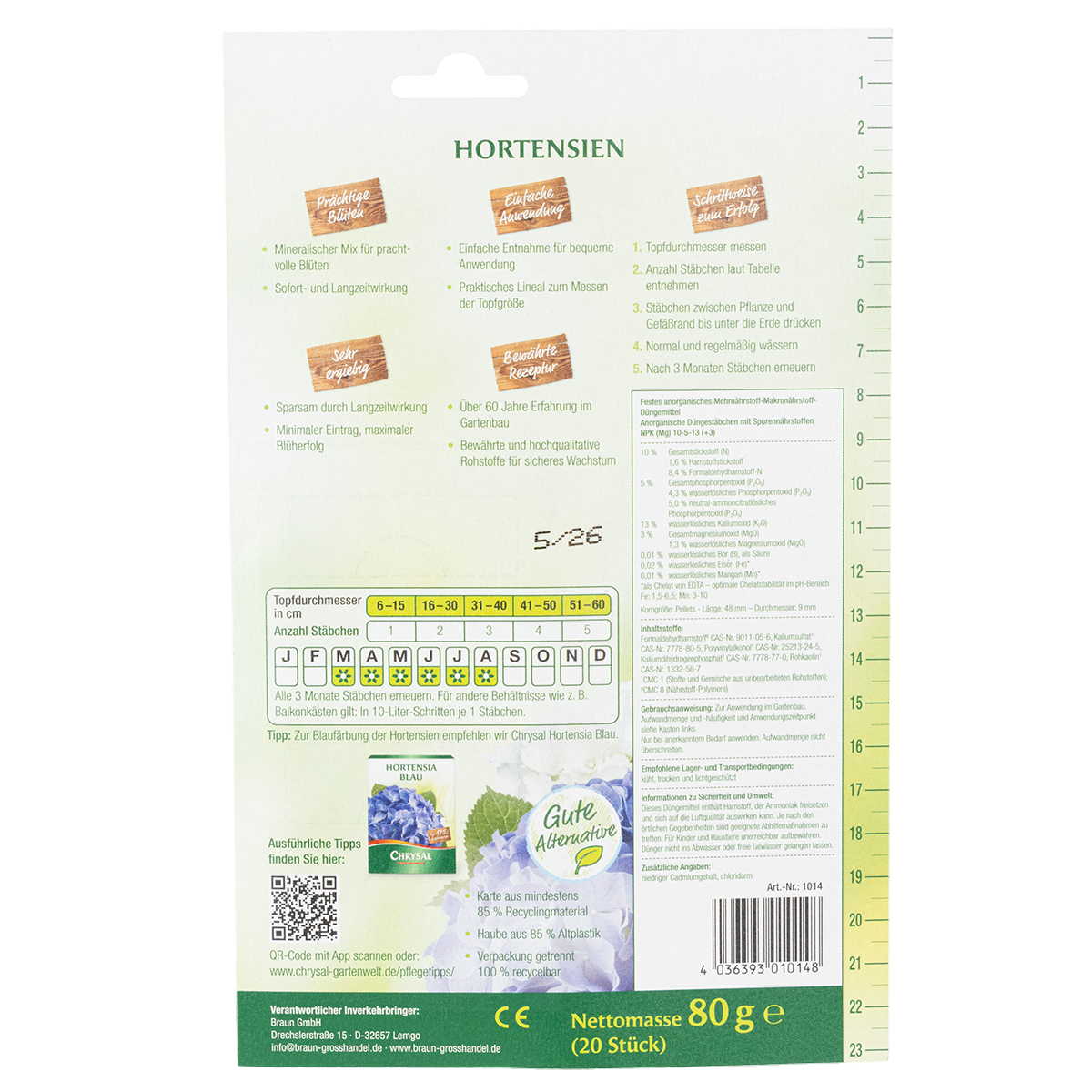 Die Chrysal Düngestäbchen lassen sich ideal für saisonale Aktionen im Handel einsetzen und kombinieren sich gut mit weiteren Warengruppen wie Pflanzgefäßen, Hortensienpflanzen und Gartenzubehör. Aufgrund der geringen Verpackungsgröße sind sie platzsparend lagersicher und eignen sich hervorragend als Impulsartikel für den Verkauf.