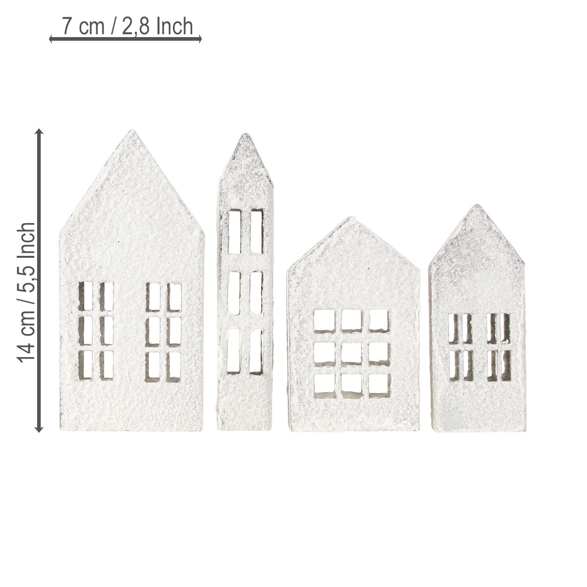 Produktname: Miniaturhäuser aus Metall für dekorative Akzente 14cm 4er-Set weiß zeitlos und vielseitig