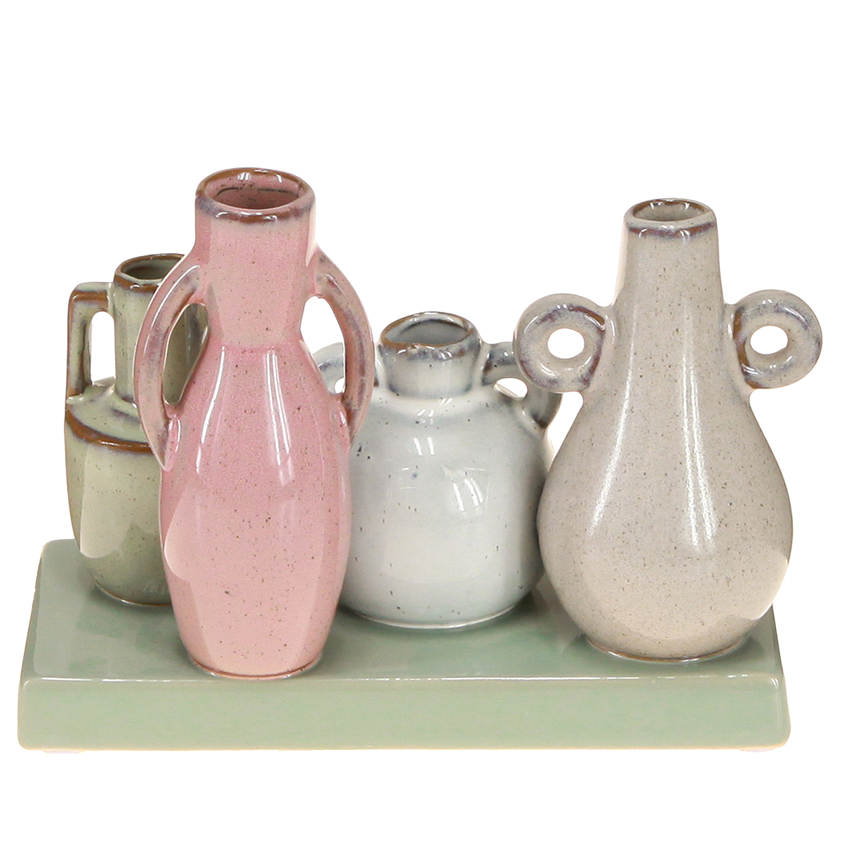 Mini Keramikvasen Set auf Tablett in Rosa, Grün und Weiß für stilvolle Deko