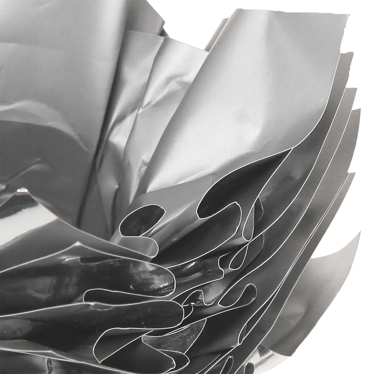 Der Übertopf besteht aus wasserfestem Kunststoff. Außen glänzt die Verpackung für die Blume silbern. Die Innenseite wirkt in mattem Grau dazu sehr edel. Nach oben weitet sich der Topf ein wenig.