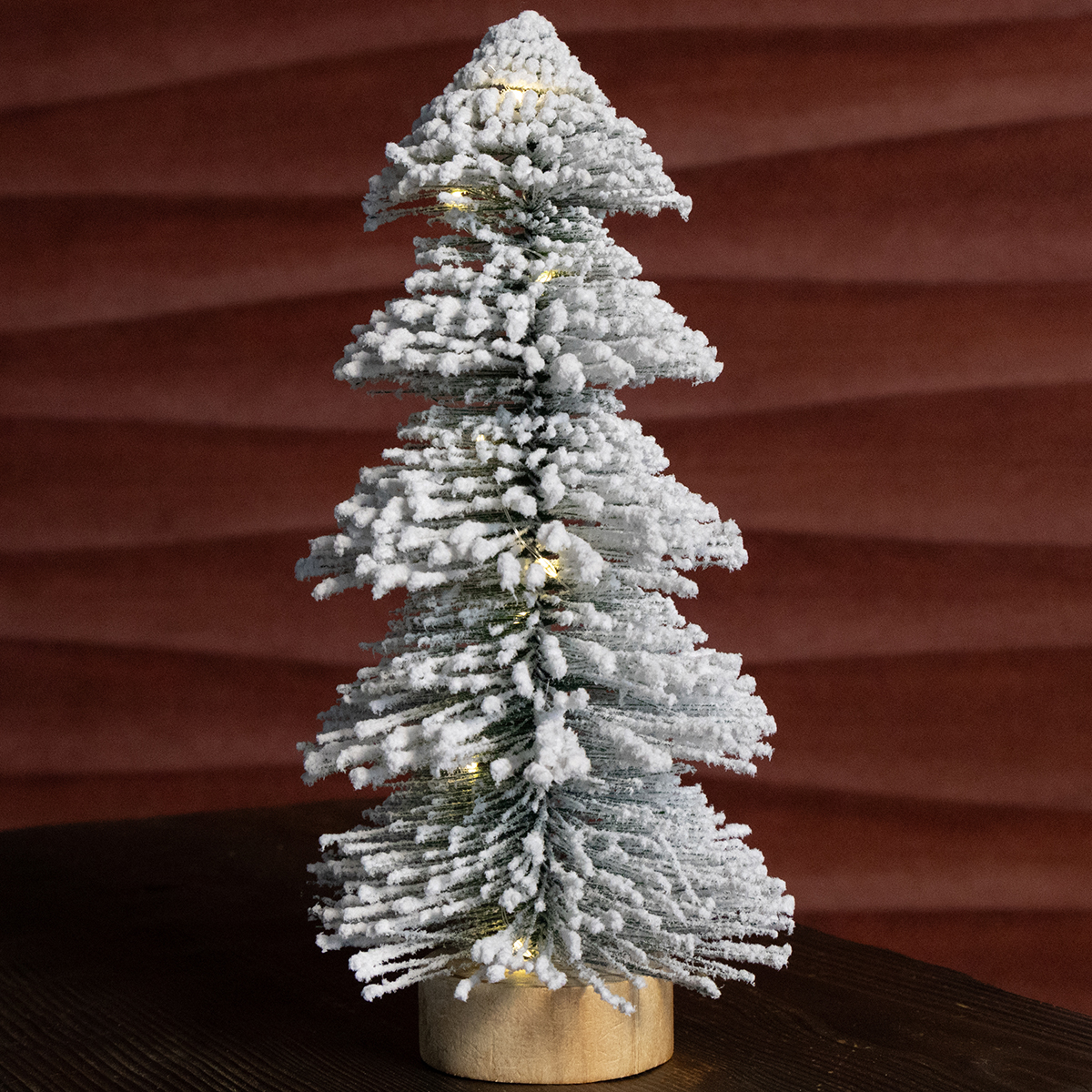 Mini Weihnachtsbaum 28cm mit LED Beleuchtung, verschneite Tanne auf Holzsockel