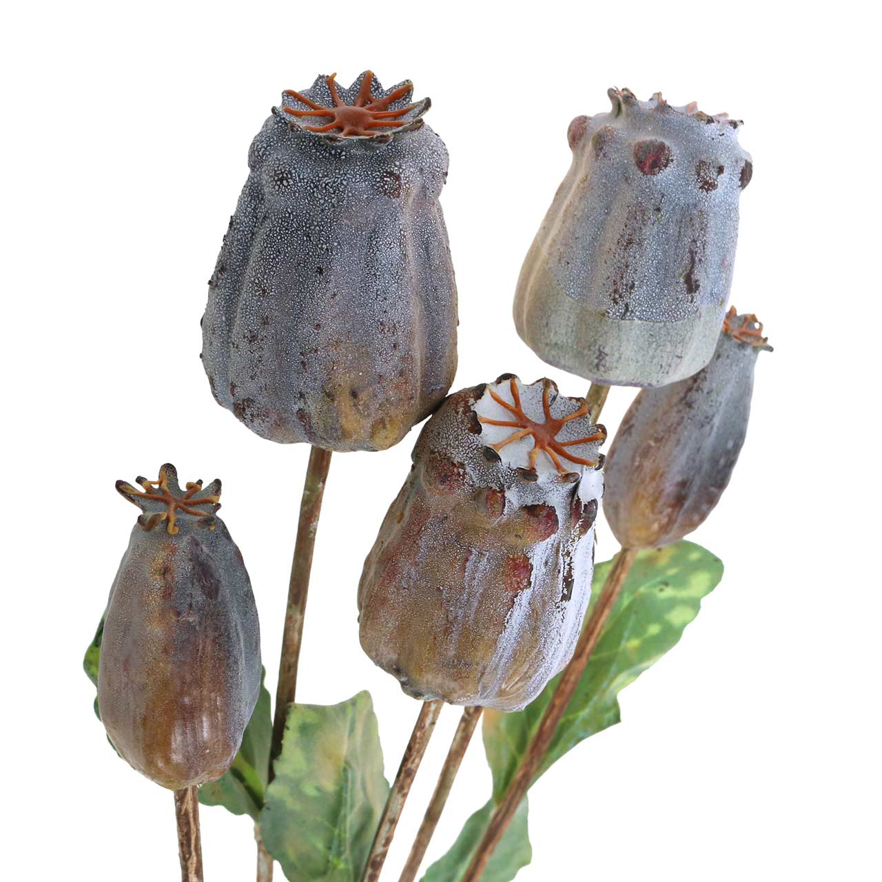 Sie bekommen einen Stiel mit künstlichen Mohnkapseln in Gelb, Braun und Violett. Dabei verzweigt sich der Stiel weiter in drei kleinere und zwei größere Samenkapseln. Die kleinere Kapsel kommt auf einen Durchmesser von circa 2,5 Zentimetern und die größere erreicht in etwa 3,7 Zentimeter. Die Höhe entspricht ungefähr 5 Zentimetern. Mit Stiel haben die Kunstpflanzen die stattliche Gesamtlänge von rund 70 Zentimetern.