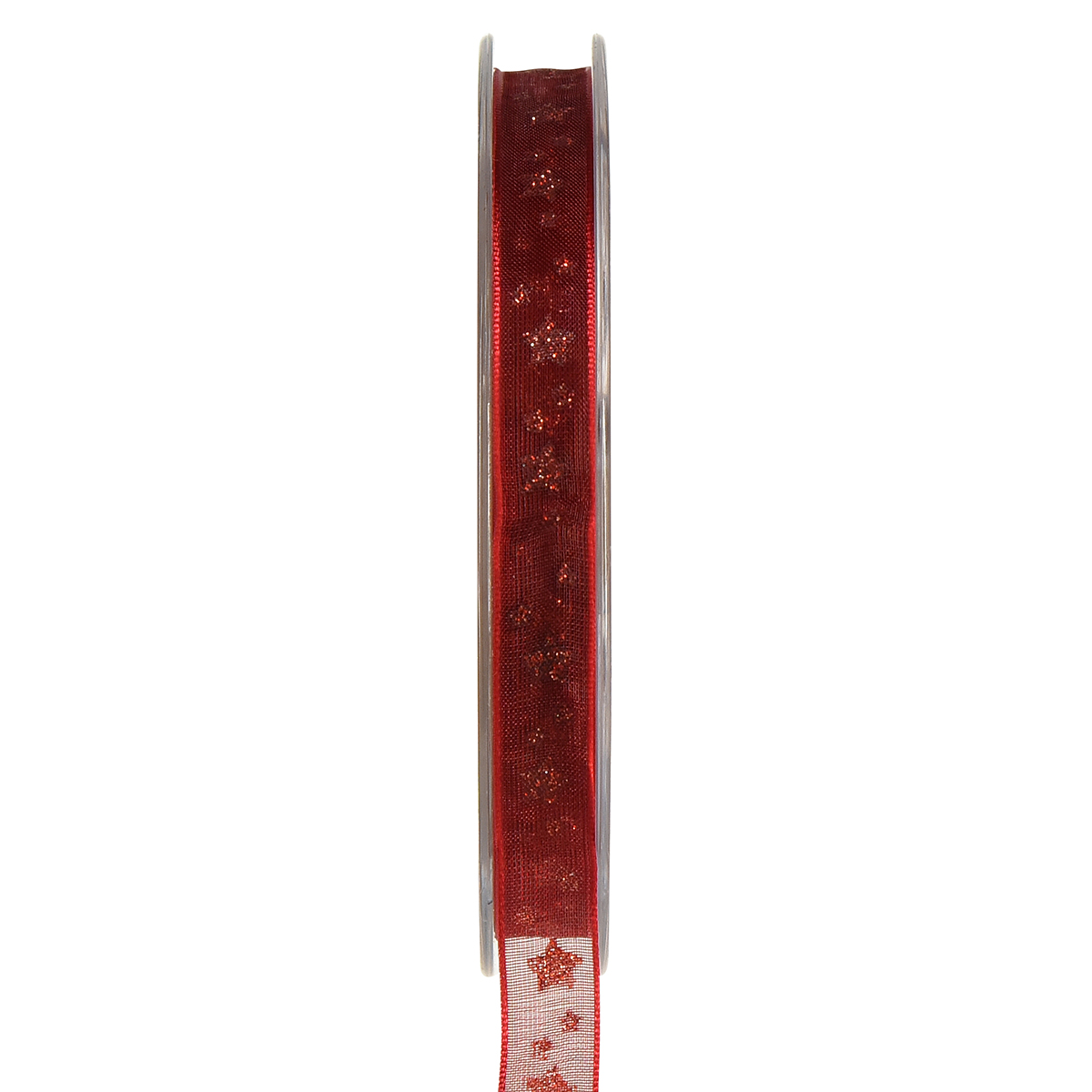Organzaband Rot mit funkelnden Sternen – Weihnachtsband 10mm 20m