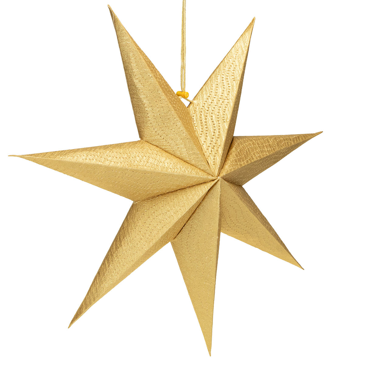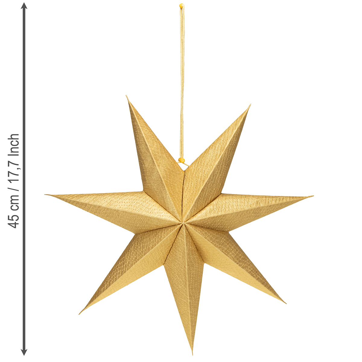 Diese Papiersterne in Gold verbinden zeitgenössisches Design mit zeitloser Eleganz und passen perfekt zu einem modernen Einrichtungsstil. Mit einer großzügigen Größe von 45 cm und dem changierenden Goldton ziehen die Sterne alle Blicke auf sich. Das hochwertige Papier besitzt eine fein gearbeitete Musterung, die das Licht stilvoll reflektiert.