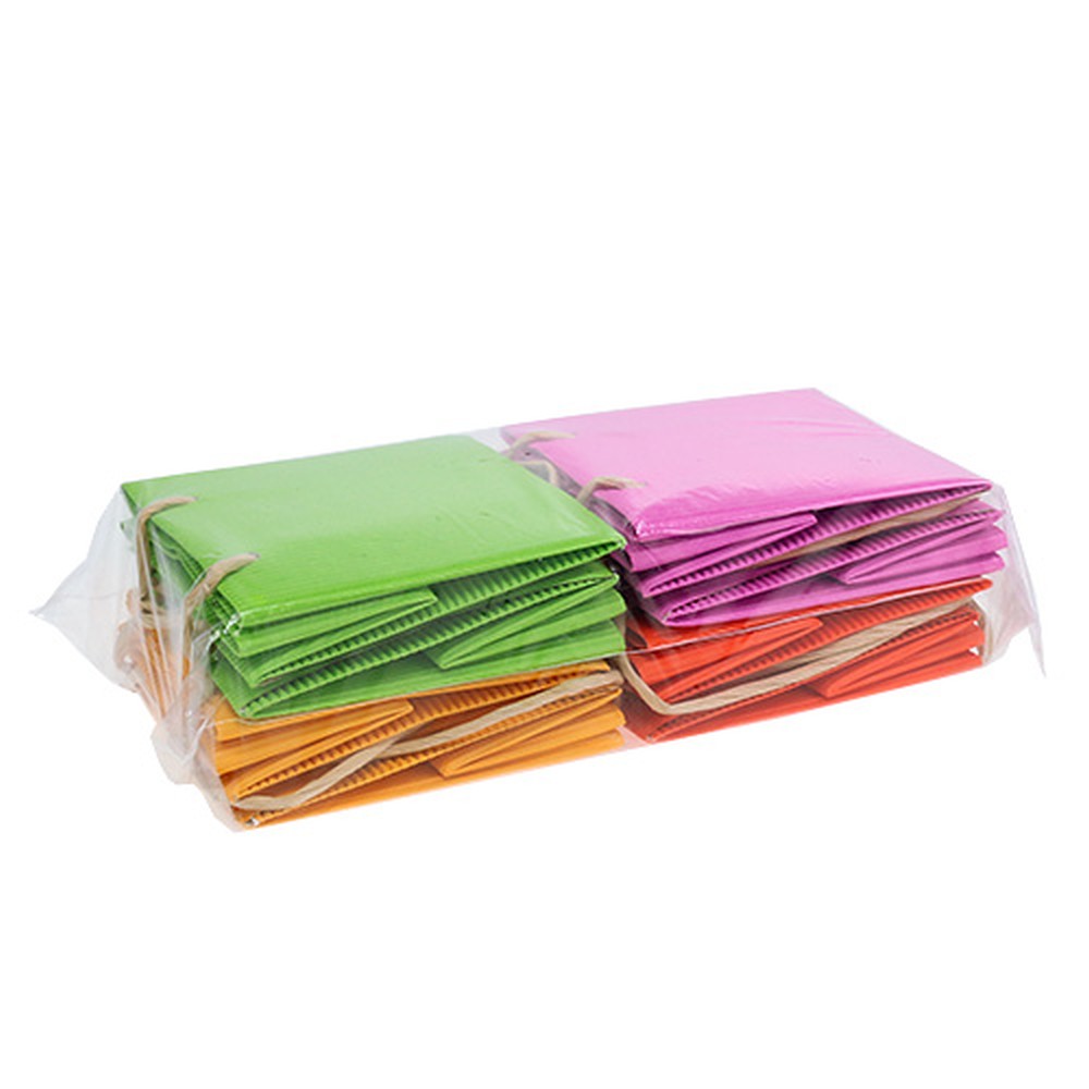 Die Papiertasche ist Teil eines 8er-Sets, wobei jeweils 2 Taschen in Orange, Grün, Gelb oder Rosa gefärbt sind. Die Maße jeder Tasche betragen circa 10,5 x 10,5 x 10,5 Zentimeter. Die Geschenktasche ist auch deswegen so stabil, weil Ihre Oberfläche geriffelt ist und somit mehr Gewicht aushält. Außerdem ist der Boden noch mit einer zusätzlichen Pappe verstärkt. Ganz schick macht sich die Tragetasche auch, wenn Sie selbstgebackene Plätzchen oder andere Leckereien hineinfüllen und diese dann ganz stylisch zu einem Treffen mit Freunden mitnehmen.