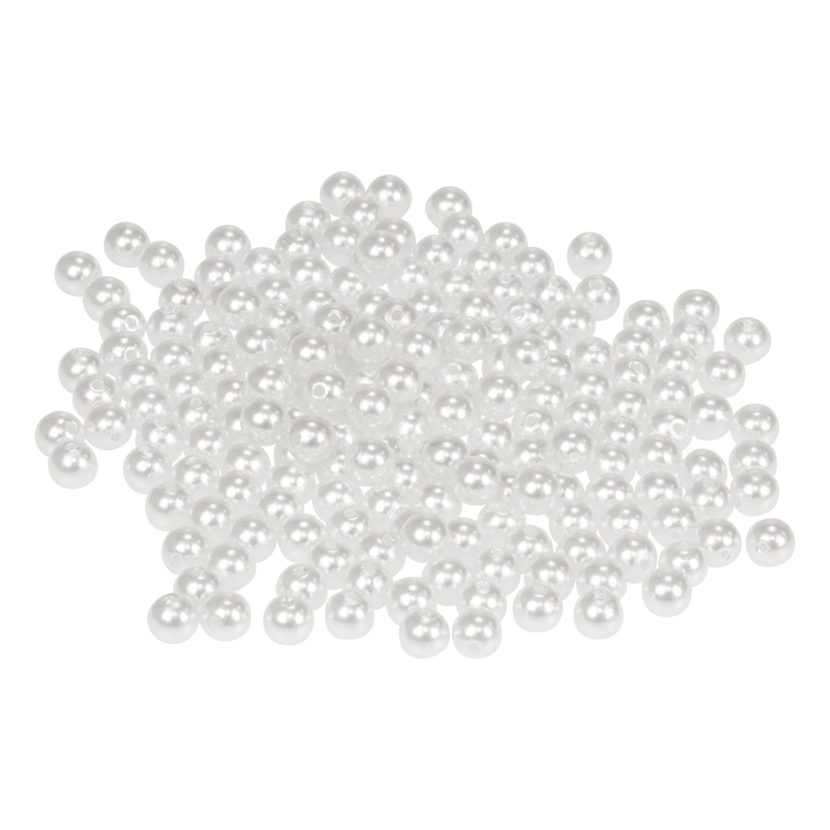 Die Kunststoff-Perlen in Weiß erhalten Sie in einer Packung mit einem Gewicht von etwa 300 Gramm. Dies entspricht einer Menge von circa 1100 Perlen. Eine einzelne Perle hat einen Durchmesser von rund 6 Millimetern.