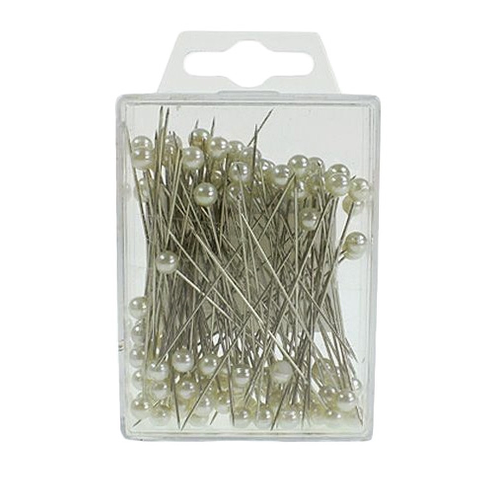 Die Perlkopfnadel befindet sich einer kleinen Plastikbox zu insgesamt 150 Stück. Jede Nadel hat eine Länge von etwa 40 Millimetern, während die Deko-Perle einen Durchmesser von ungefähr 4 Millimetern hat.