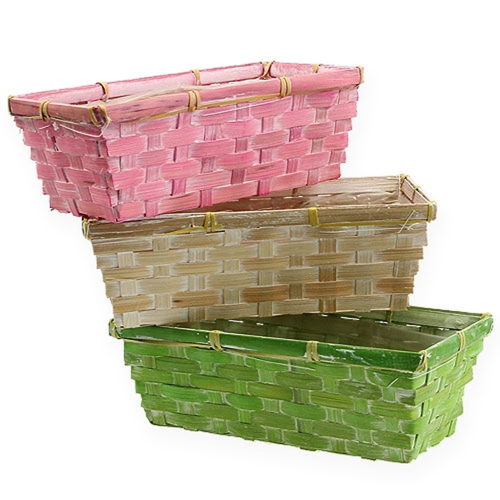 Jeder eckige Pflanzkorb aus dem mehrfarbig sortierten Set hat in etwa die Maße 20 x 11 x 7 Zentimeter. Die Stellfläche misst ungefähr 16 x 7 Zentimeter. In dem Set zu 8 Stück sind die Farben Rosa und Grün jeweils dreimal, die Farbe Natur zweimal vorhanden.