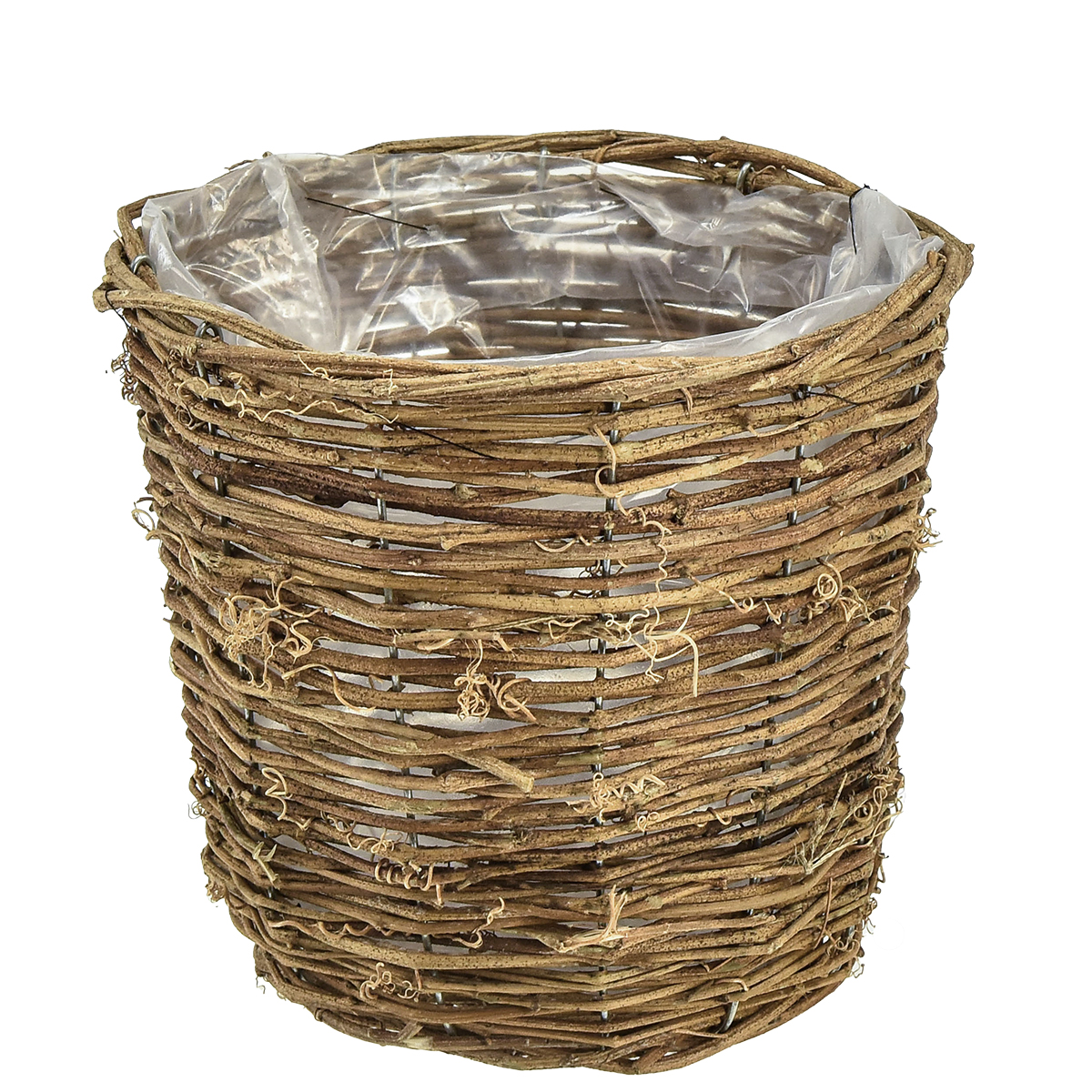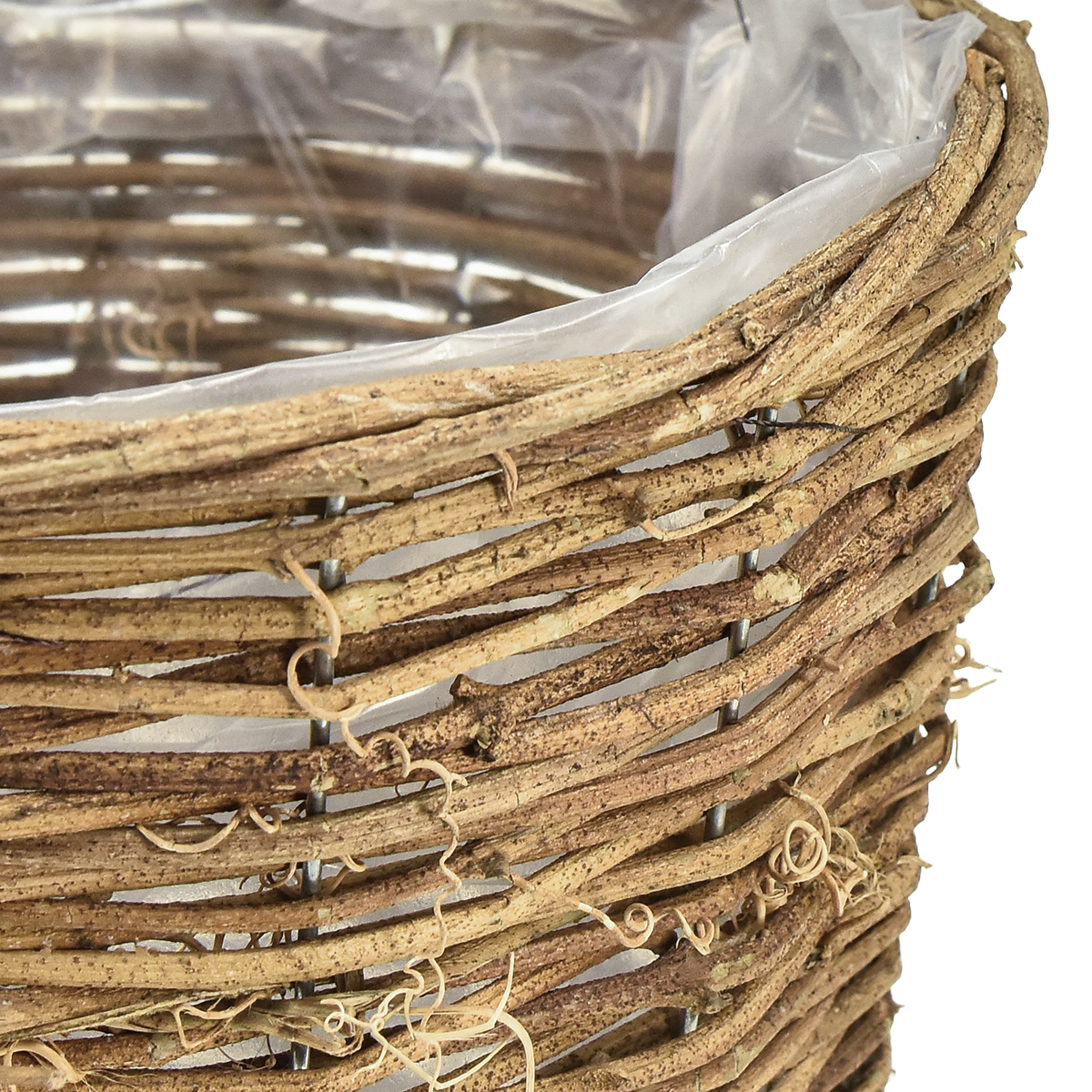 Der Pflanzkorb in Natur besticht durch seine hochwertige Verarbeitung. Sorgsam werden die Reben um eine stabile Metallbasis geflochten und so jeder Korb zu einem Unikat geformt. Die klare Folie ist mit dunkelbraunem Garn sicher am Metall befestigt, damit Sie Ihre Blumen und Kräuter sorglos einpflanzen können.