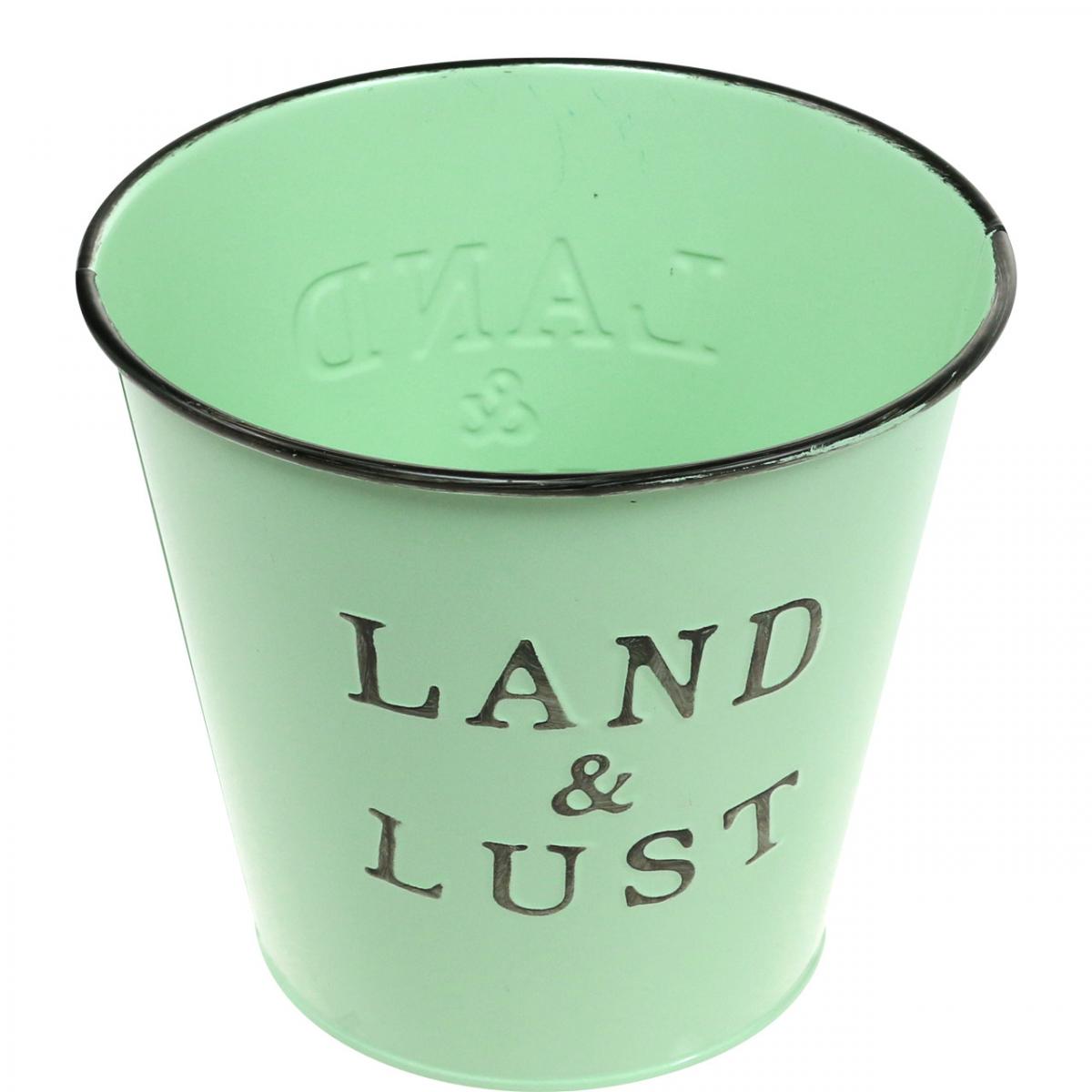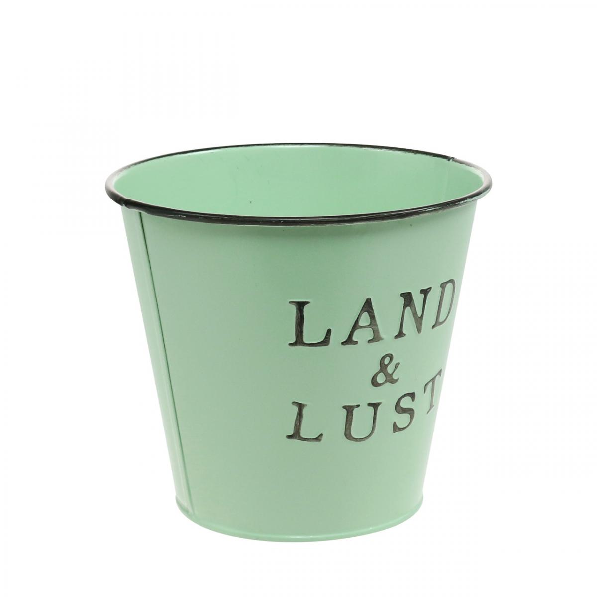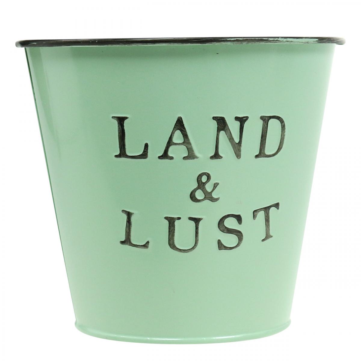 Der Pflanzkübel in Mint inspiriert zum Gärtnern und Dekorieren für den Frühling! Der Deko-Übertopf besteht aus Metall und erhält durch den schwarzen Rand mit leichten „Abnutzungsspuren“ und den schwarz gebürsteten Retro-Schrift „Land & Lust“ ein einzigartiges Retro-Flair. Bitte denken Sie daran, den Blumentopf vor dem Bepflanzen mit Folie auszukleiden, damit die Feuchtigkeit nach dem Gießen keinen Schaden anrichten kann.