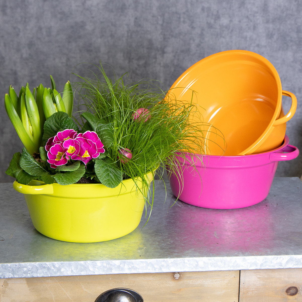 Pflanzschalen Set 25cm aus Blech mit Henkel in Rosa, Orange und Grün für Frühlingsdekoration