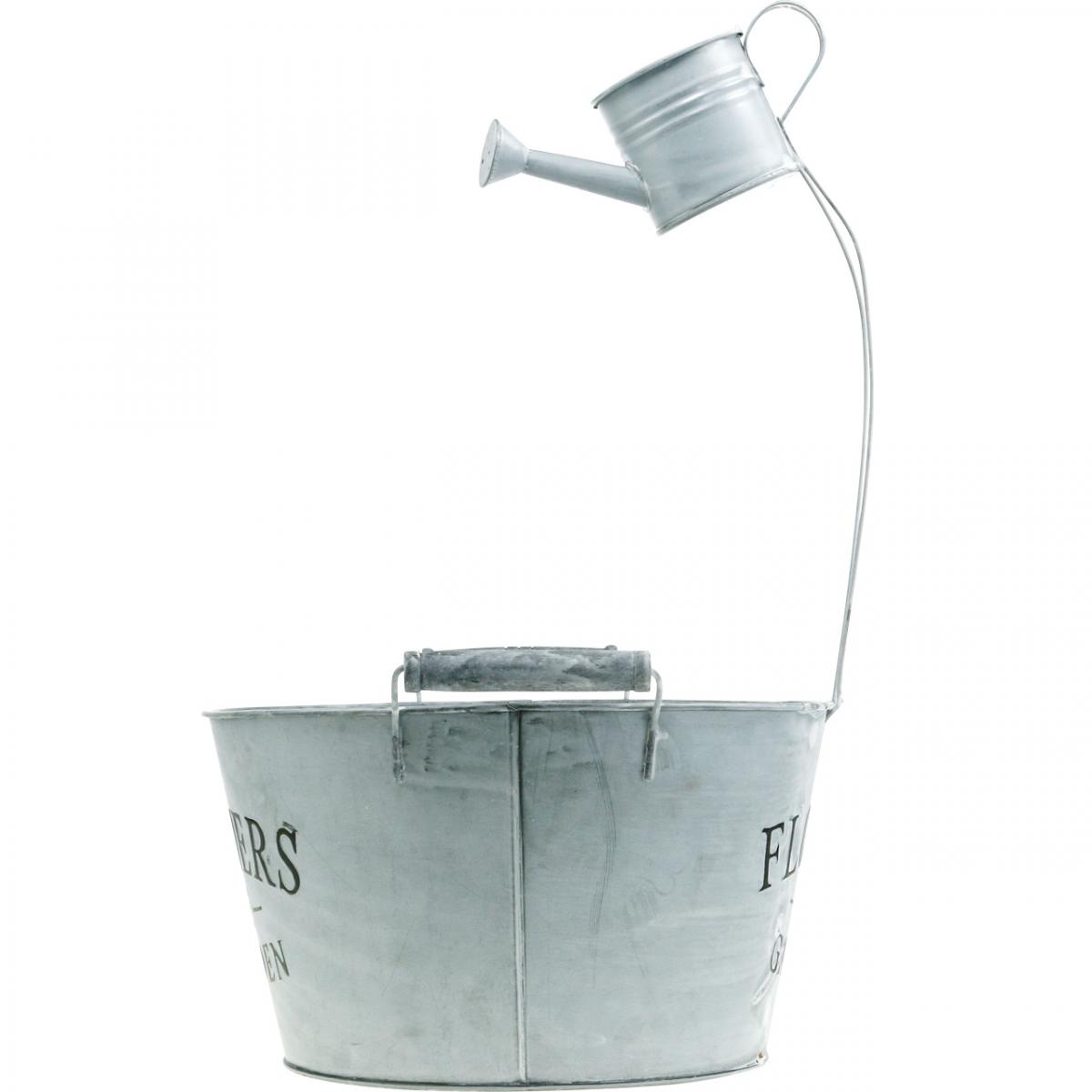 Pflanzschale mit Gießkanne, Gartendeko, Metallgefäß zum Bepflanzen Silbern Weiß gewaschen H41cm Ø28cm/Ø7cm