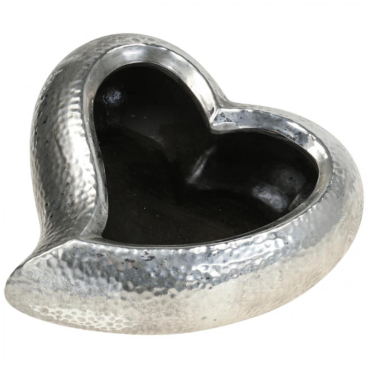 Das Pflanzgefäß ist etwa 24 Zentimeter breit und 10 Zentimeter hoch. An der Außenseite ist die schöne Herz-Deko-Blumenschale silbern glänzend glasiert und weist eine Oberfläche, die wie gehämmerte Metalldeko aussieht, auf.