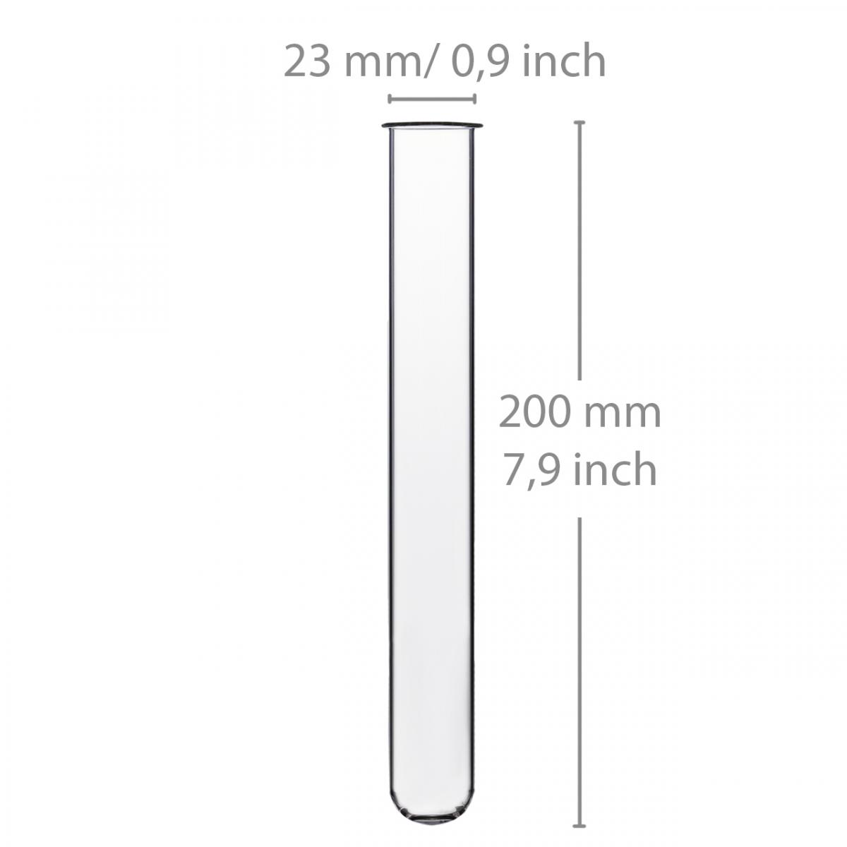 Das Reagenzglas wird mit einer Länge von ungefähr 200 Millimetern und einem Innendurchmesser von etwa 22 Millimetern geliefert; der nach außen gebogene Rand sorgt für einen Außendurchmesser von circa 28,5 Millimetern.