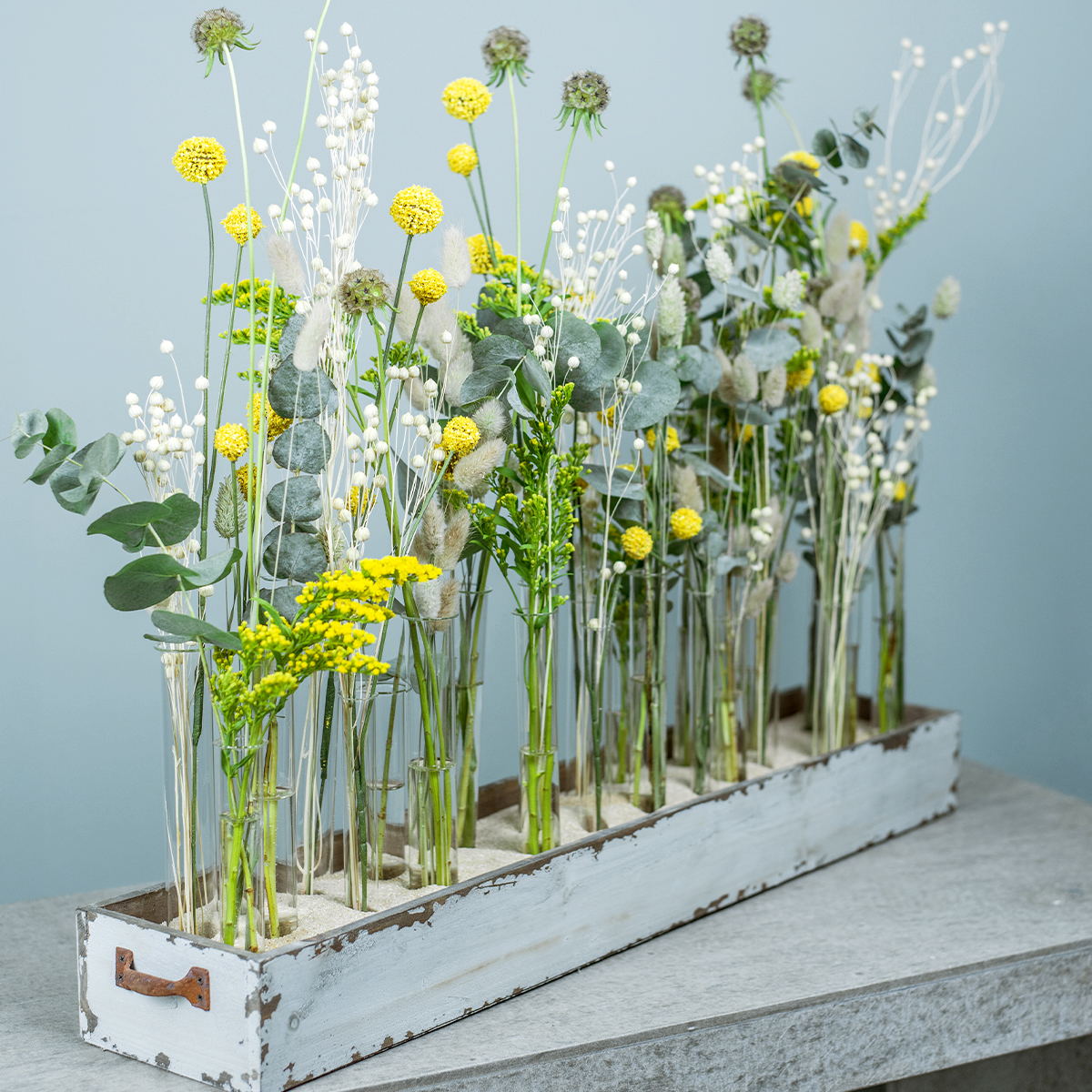 Mithilfe von gekauften oder selbst gebastelten Reagenzglasständern aus Holz oder Reagenzglashaltern aus Metall lassen sich mehrere der Röhrchen sehr hübsch auf einer Feierlichkeit wie zum Beispiel einer Hochzeit einsetzen: An den Kirchenbänken oder auf der Festtafel sehen sie mit zarten Blumenkompositionen darin besonders toll aus. Dabei müssen die Wasserröhrchen auch nicht in ein opulentes Arrangement eingearbeitet werden, sondern können ganz raffiniert und gut sichtbar mit einer einzelnen Blüte beispielsweise in einen flachen Holzquader mit eingesägten Löchern gesteckt werden. Dadurch kommt beispielsweise bei einer Scheunenhochzeit oder auch bei Ihnen im Wohnzimmer ein entspanntes Landhaus-Feeling auf.