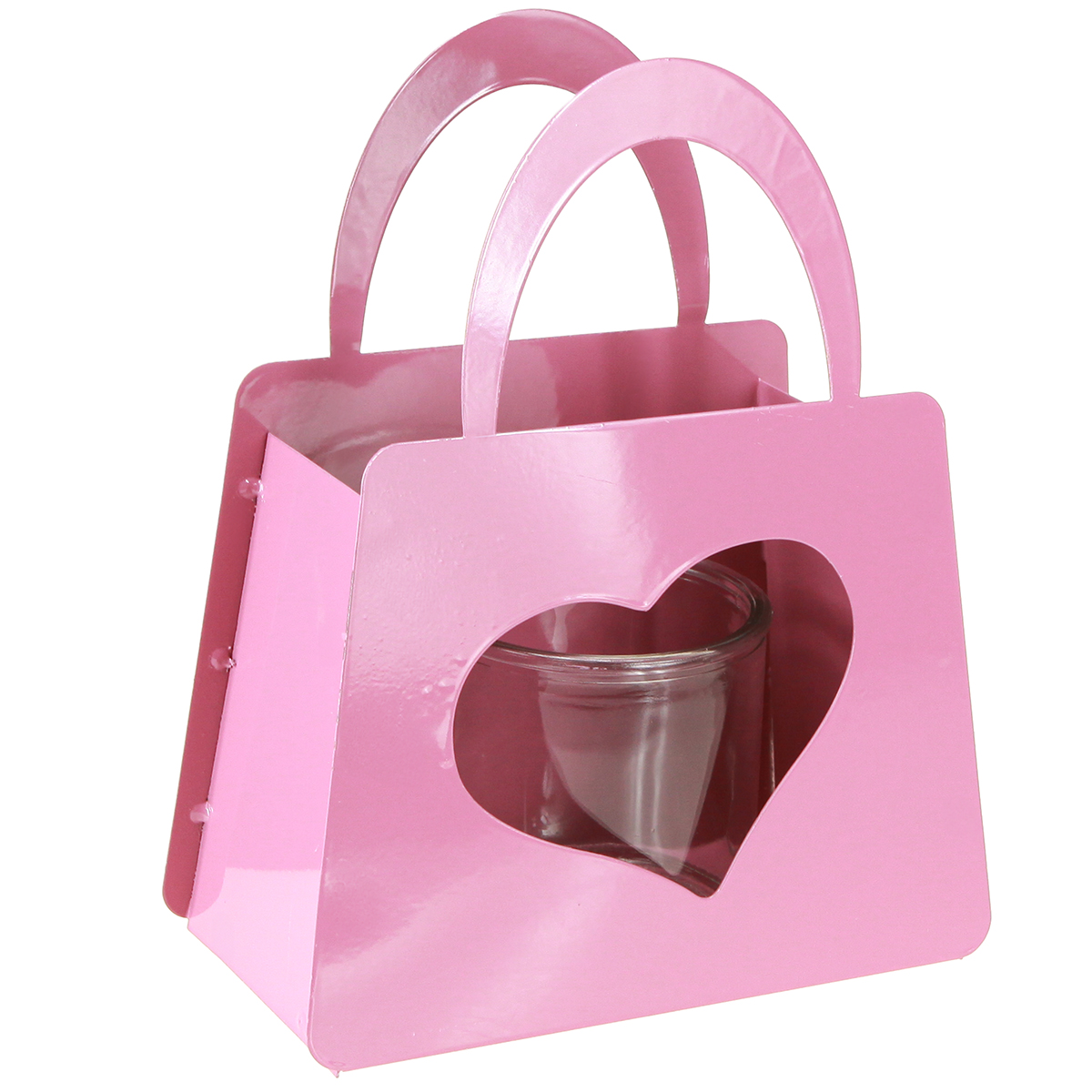 Produktname: Romantisches Windlicht Metall Tasche Rosa mit Herz H26cm für Floristen