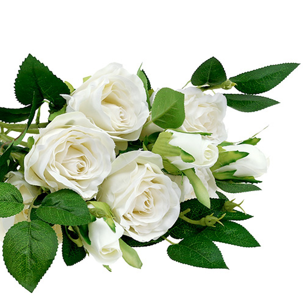 Der künstliche Rosenstrauß in Weiß hat eine Gesamtlänge von etwa 46 Zentimetern, während der Blütendurchmesser zwischen 3 und 6 Zentimeter beträgt.