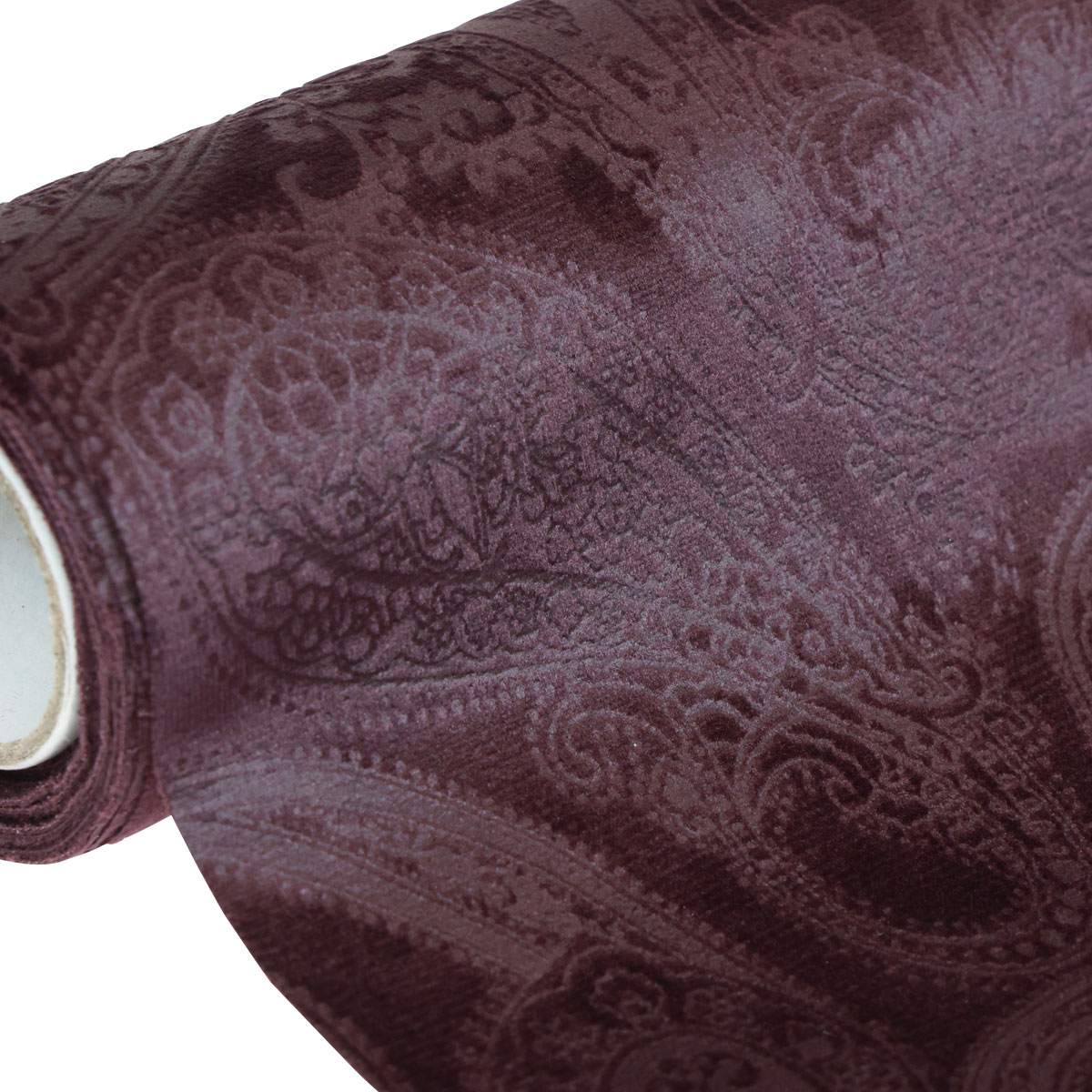 Der schöne Stoff fühlt sich an wie Samt und ist mit einem detailreichen Paisley-Muster geprägt. Während das Samtband in Aubergine schimmert, wirkt das Muster etwas heller und kommt dadurch im Lichtschein besonders gut heraus.