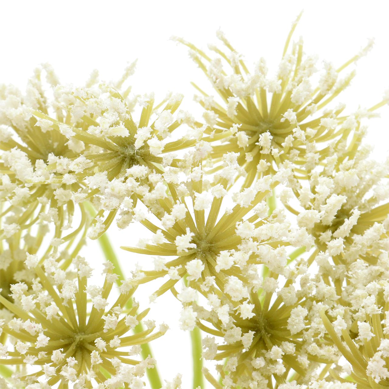 Die künstliche Schafgarbe in Weiß hat eine Länge von etwa 84 Zentimetern, wobei der Durchmesser des Blütenkopfes circa 25 Zentimeter beträgt. Sie besteht vollständig aus Kunststoff beziehungsweise Seidenstoff.